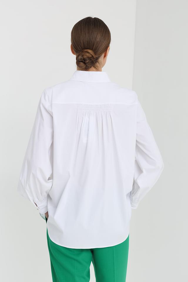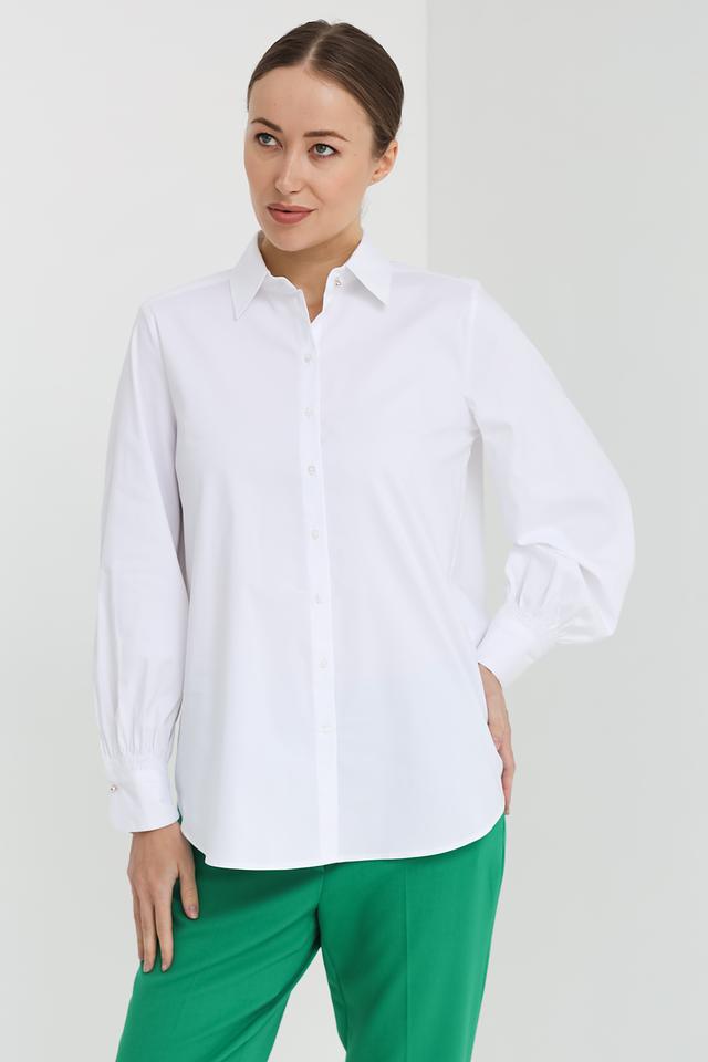 Модель имеет длинные рукава с манжетами на пуговицах, что позволяет регулировать их длину и создавать различные образы. Классический воротник рубашки придает ей элегантный вид. Рубашка идеально подходит для создания повседневных и деловых образов, легко сочетается с брюками, юбками и джинсами.
