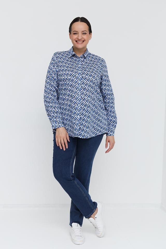 Рубашка имеет длинные рукава и классический крой, который подходит для различных типов фигур. Яркий геометрический принт в синих оттенках делает эту модель особенно привлекательной и оригинальной.