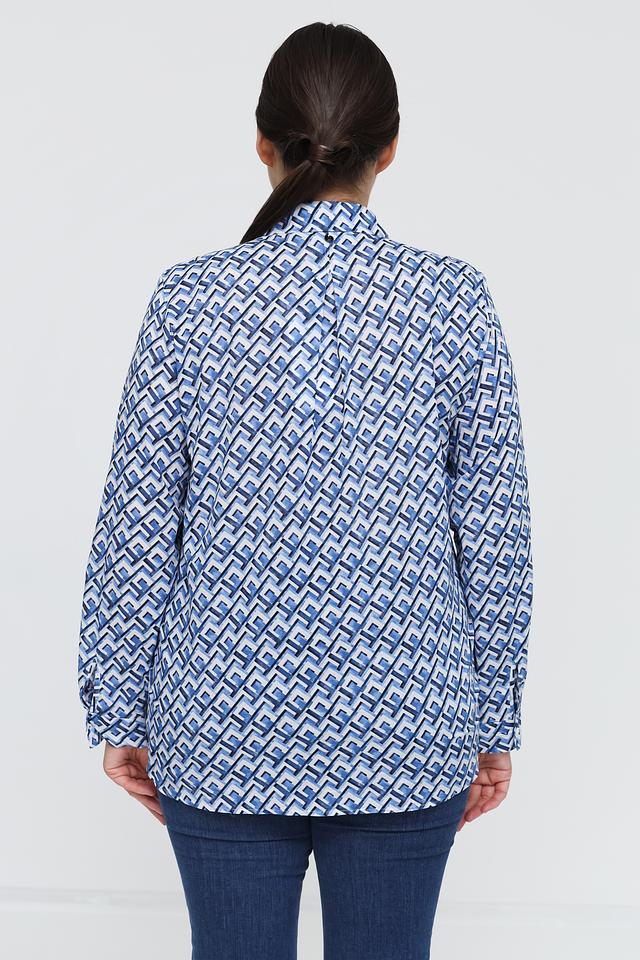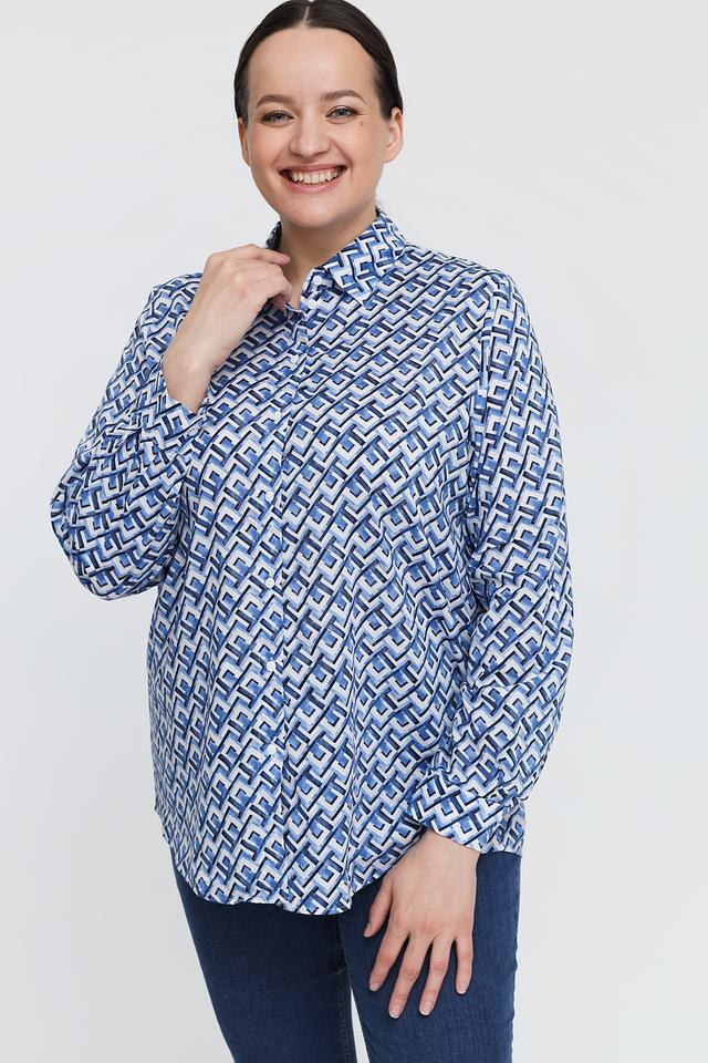 Женская рубашка Gerry Weber синего цвета с оригинальным геометрическим принтом. Модель выполнена из 100% органического хлопка, обеспечивающего комфорт и воздухопроницаемость. Состав: хлопок органич. 100%