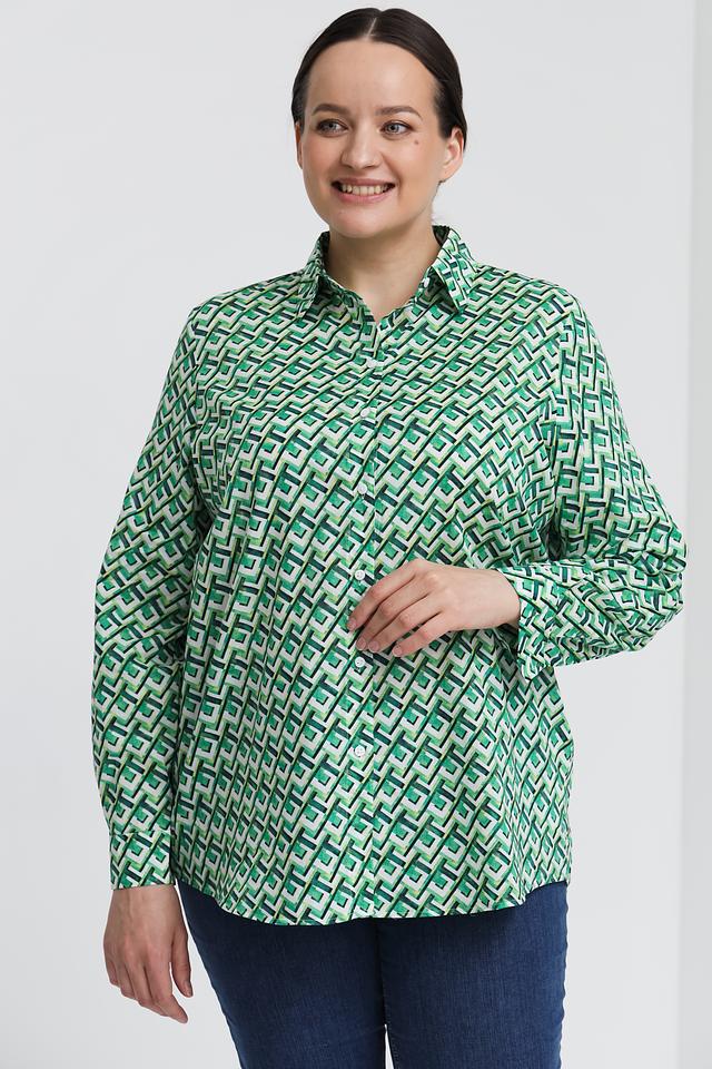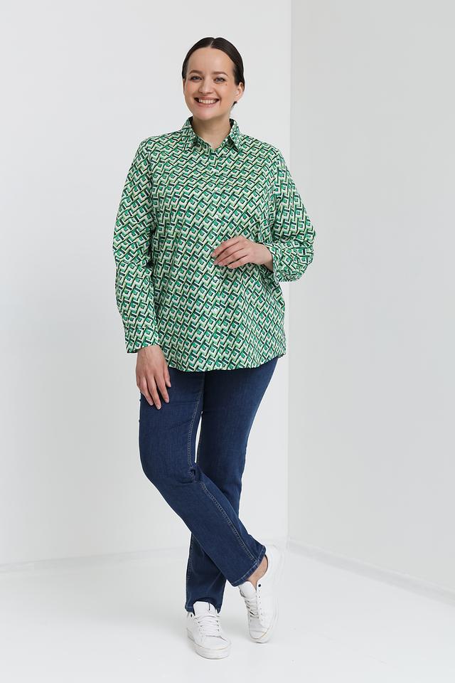 Рубашка имеет классический крой с длинными рукавами и отложным воротником. Особенностью модели является яркий геометрический принт в зеленых тонах, который добавит образу оригинальности.