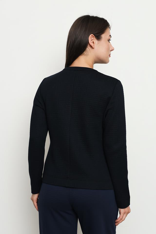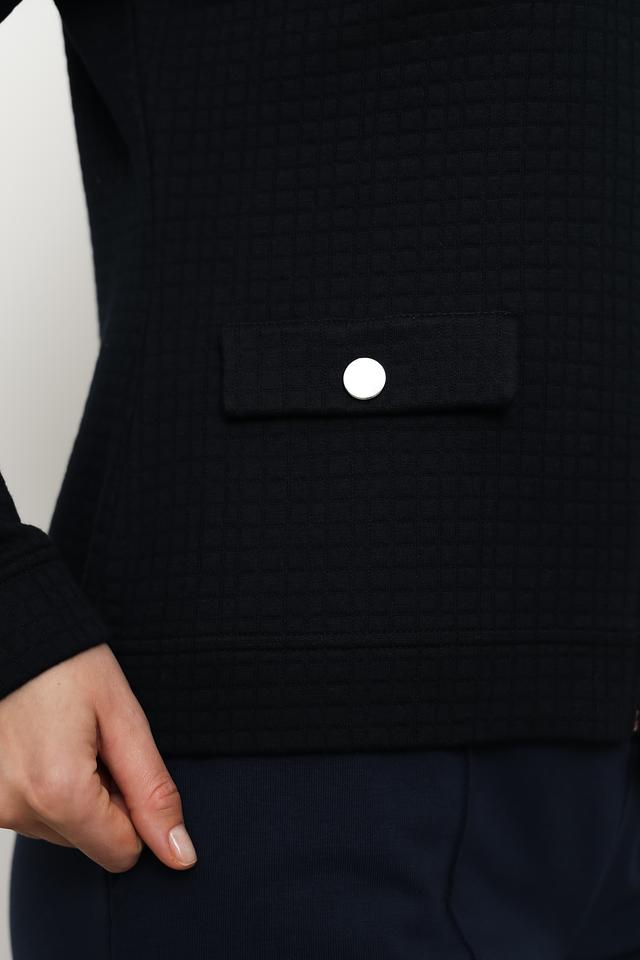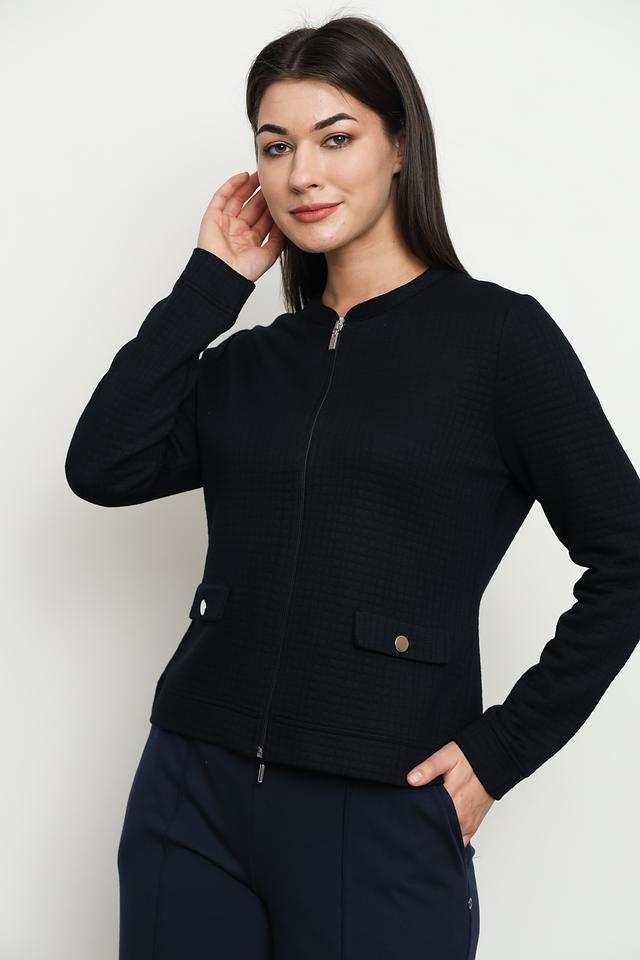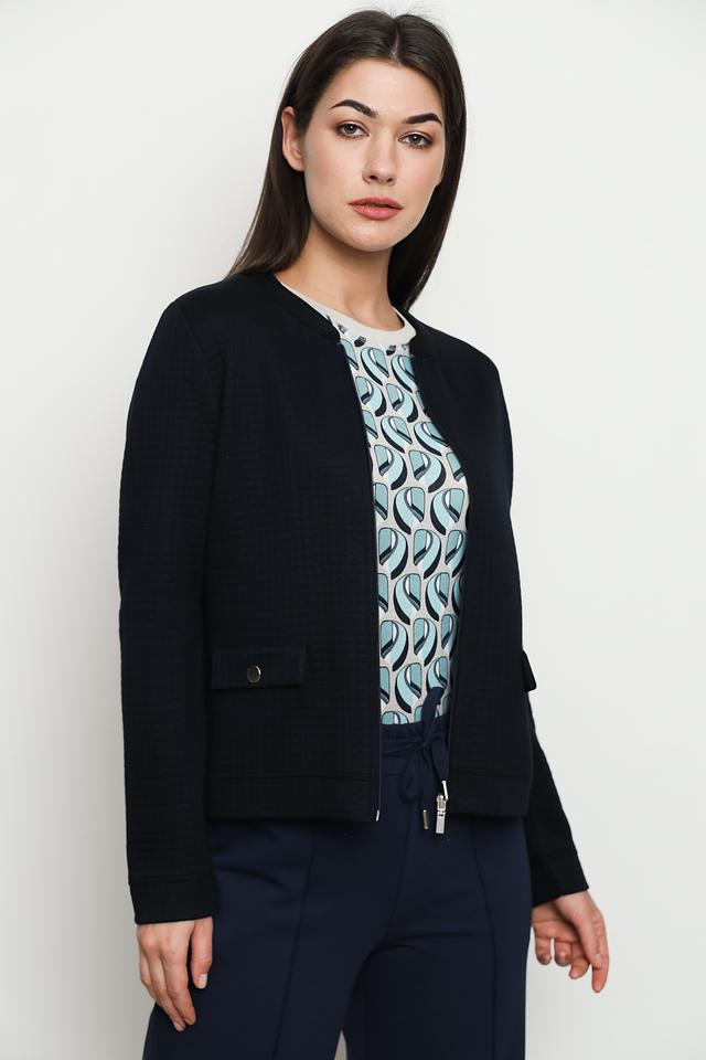 Жакет застегивается на молнию и имеет круглый вырез горловины. На полочках расположены накладные карманы с клапанами, которые добавляют модели функциональности и стиля.
