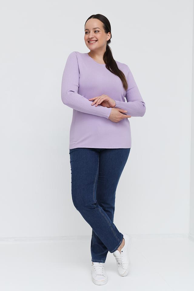 Модель имеет прямой крой, круглый вырез горловины и длинные рукава с текстурной вязкой. Текстура вязки присутствует и на основной части пуловера, что делает его более интересным и фактурным.