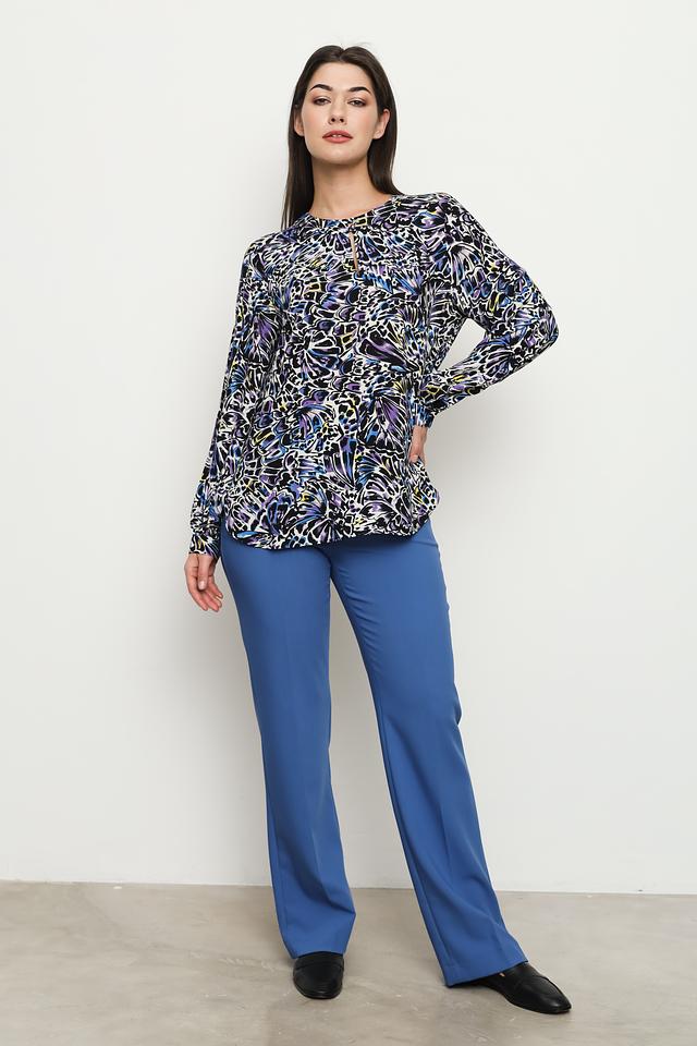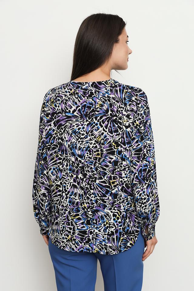 Особенностью данной блузы является яркий и оригинальный принт, выполненный в сочетании чёрного, белого, синего и фиолетового цветов. Этот рисунок делает блузу уникальной и привлекательной. Блуза идеально сочетается с брюками, юбками и джинсами, позволяя создавать разнообразные стильные образы.