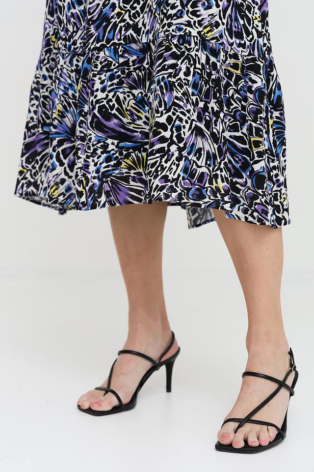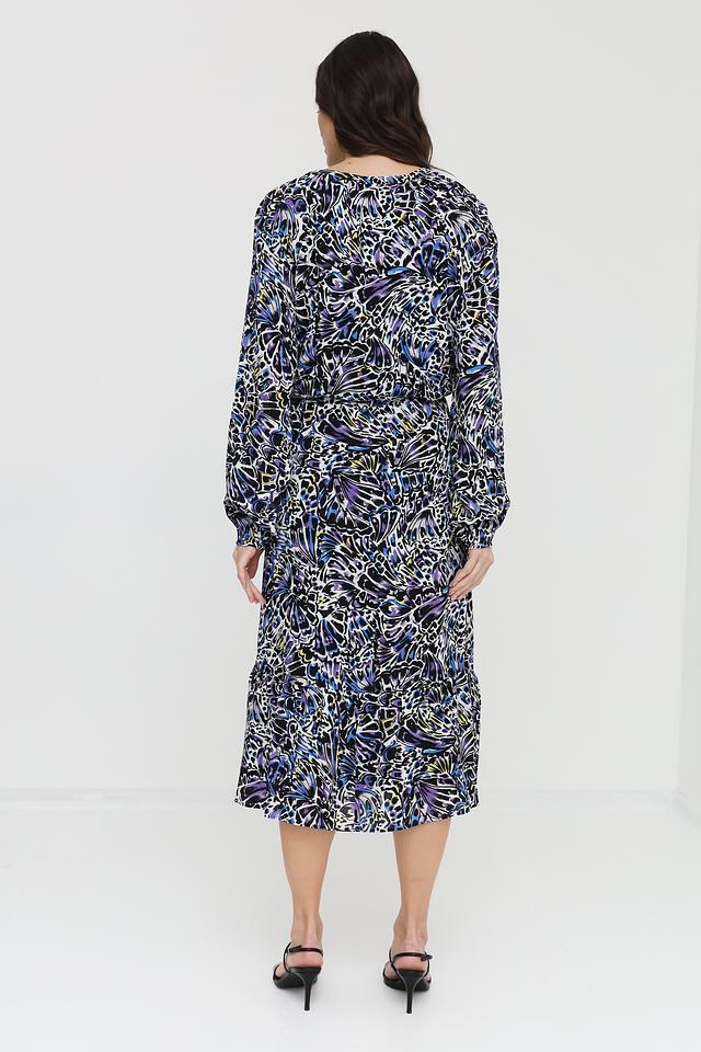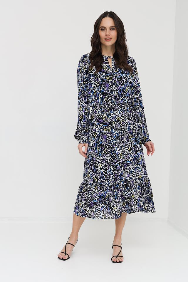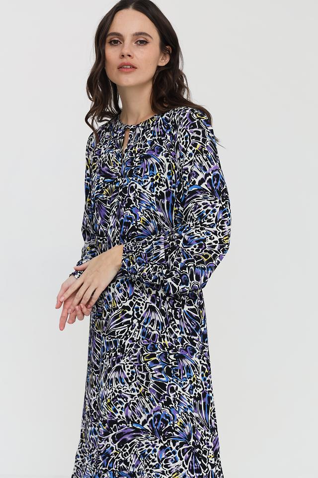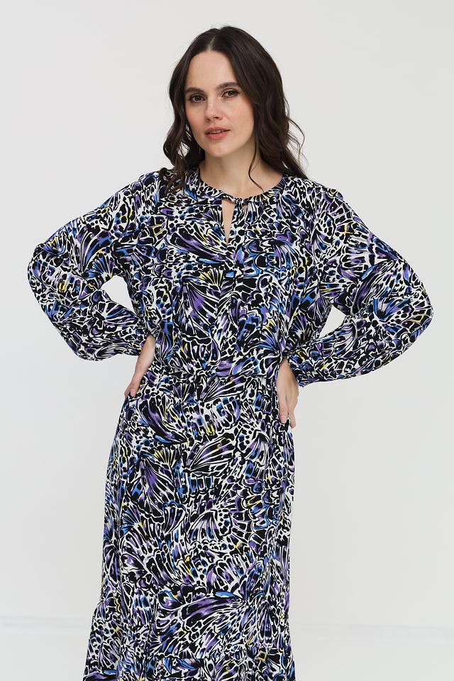 Модель отличается ярким и оригинальным цветочным принтом в синих, белых и фиолетовых тонах. Платье имеет длинные рукава с манжетами на резинке, что придает им слегка собранный вид. V-образный вырез горловины подчеркивает женственность силуэта.