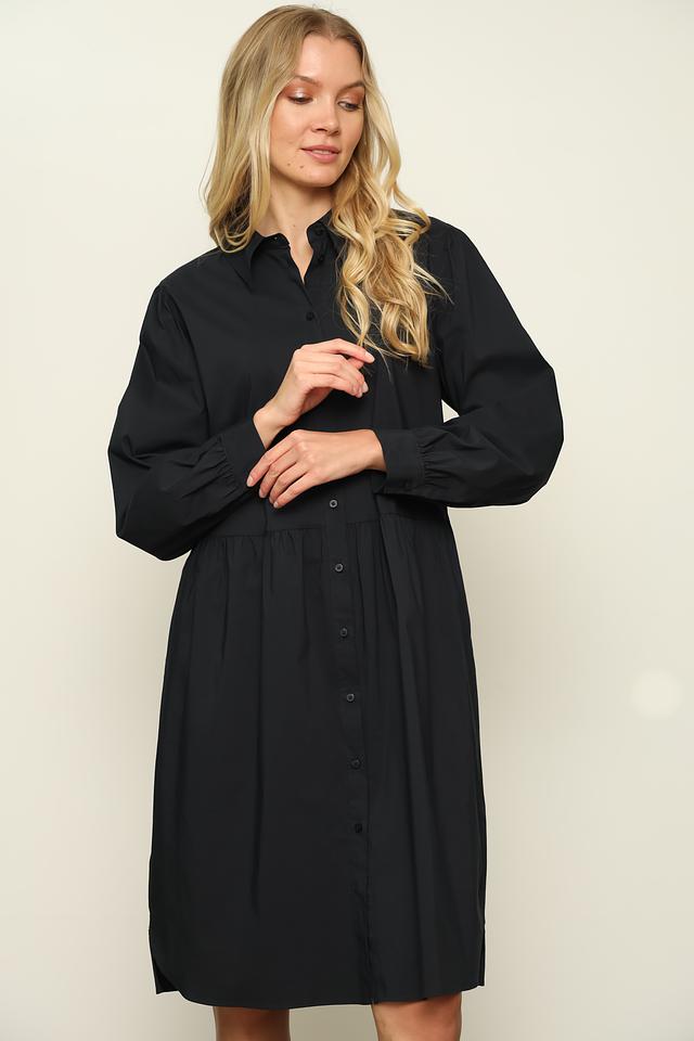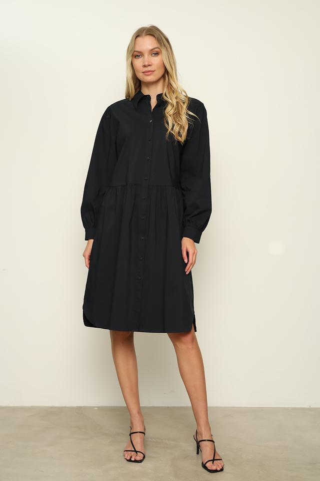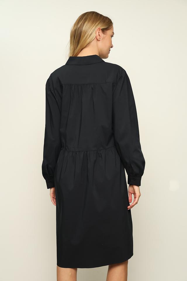 Платье имеет рубашечный крой с длинными рукавами, которые заканчиваются манжетами. Сборка на талии создает женственный силуэт и подчеркивает фигуру. Застежка на пуговицах по всей длине платья позволяет регулировать степень прилегания.