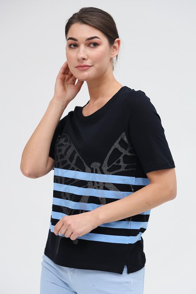 Основной цвет футболки – чёрный, который выгодно подчеркивает яркий принт в виде бабочки. Принт выполнен в сочетании голубых полос и серебристых элементов, создавая эффектный и запоминающийся образ.