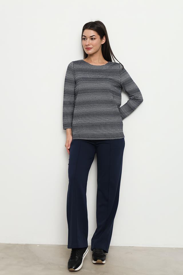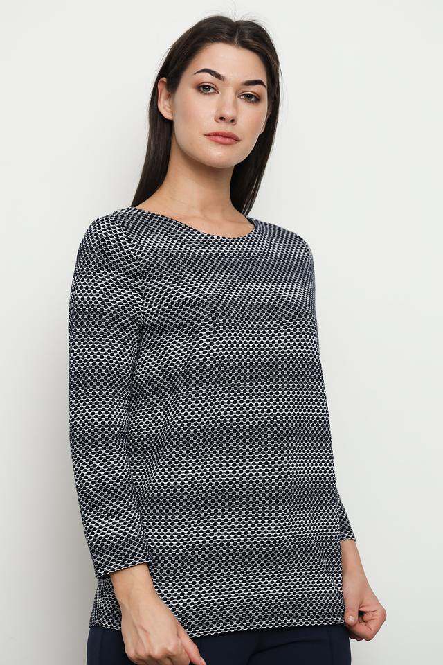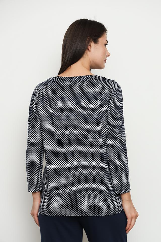Модель имеет удобный круглый вырез горловины и рукава три четверти, что делает ее универсальной для различных образов. Пуловер изготовлен из высококачественного трикотажа, в состав которого входит хлопок, полиэстер, вискоза и эластан. Благодаря этому сочетанию материалов, пуловер приятен к телу, хорошо держит форму и не требует особого ухода.