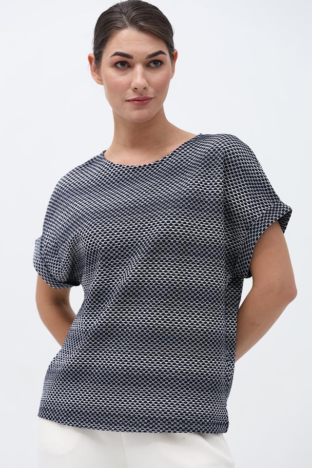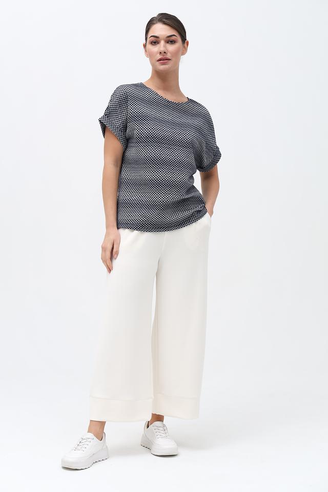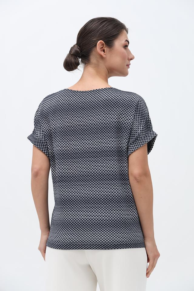 Модель имеет свободный крой, который не сковывает движений, и короткие рукава с небольшими складками, добавляющими образу лёгкость. Круглый вырез горловины делает блузу универсальной и подходящей для различных типов фигуры.