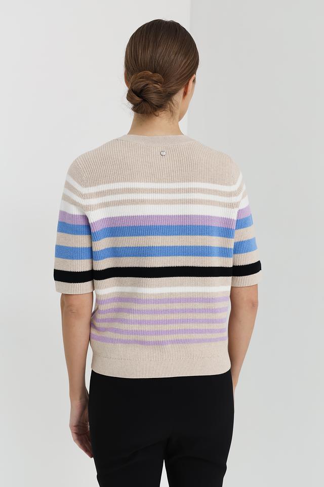 Пуловер имеет классический крой с круглым вырезом горловины и короткими рукавами, что делает его идеальным для теплой погоды или для создания многослойных образов. Яркая полосатая отделка добавляет образу динамичности и оригинальности.