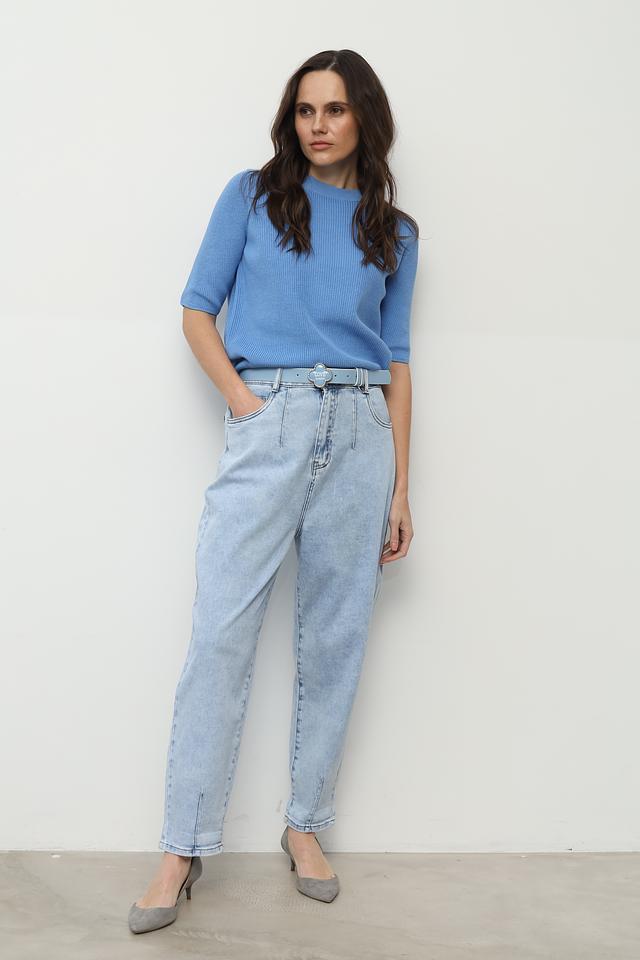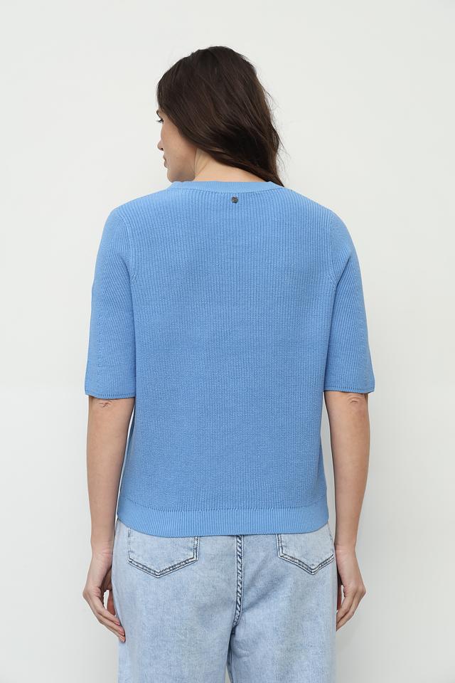 Женский пуловер Gerry Weber голубого цвета с коротким рукавом 3/4 выполнен из мягкого органического хлопка. Модель имеет круглый вырез и приятную текстуру в рубчик. Состав: хлопок органич. 100%