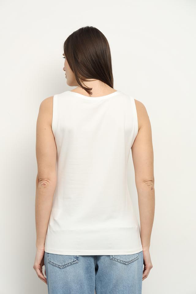 Топ имеет классический крой с округлым вырезом горловины и широкими бретелями. Благодаря простому дизайну, он легко сочетается с различными элементами одежды – джинсами, юбками, брюками или шортами.