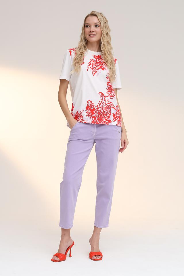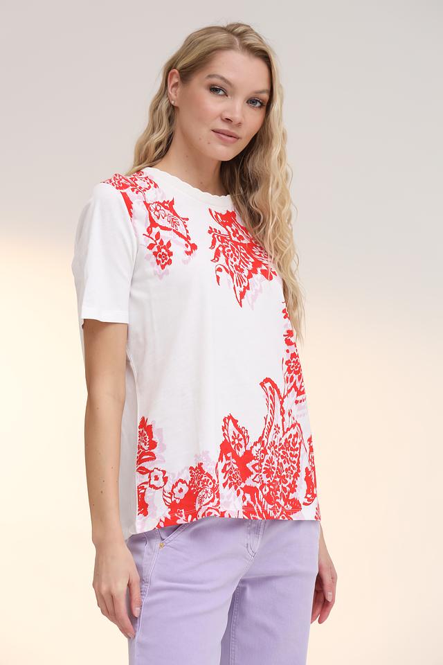 Основной цвет футболки – белый, а яркий акцент расставлен благодаря оригинальному красному принту с цветочным орнаментом. Принт покрывает переднюю часть изделия, добавляя ему выразительности и индивидуальности.