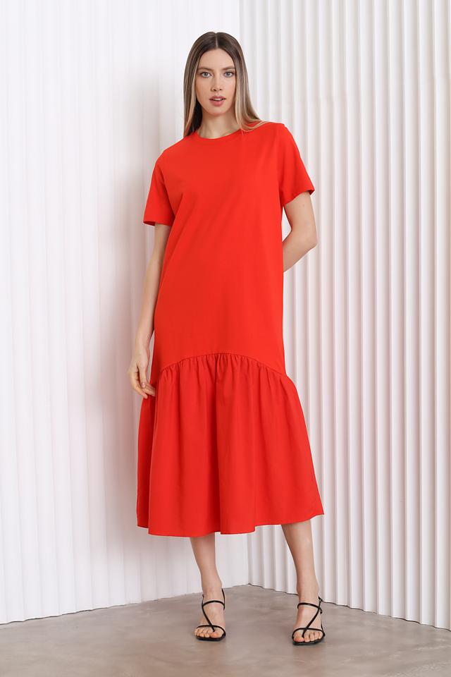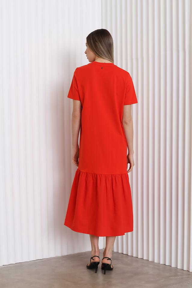 Особенностью этого платья является ярусный подол, который придает ему легкость и воздушность. Яркий красный цвет делает образ запоминающимся и привлекательным.