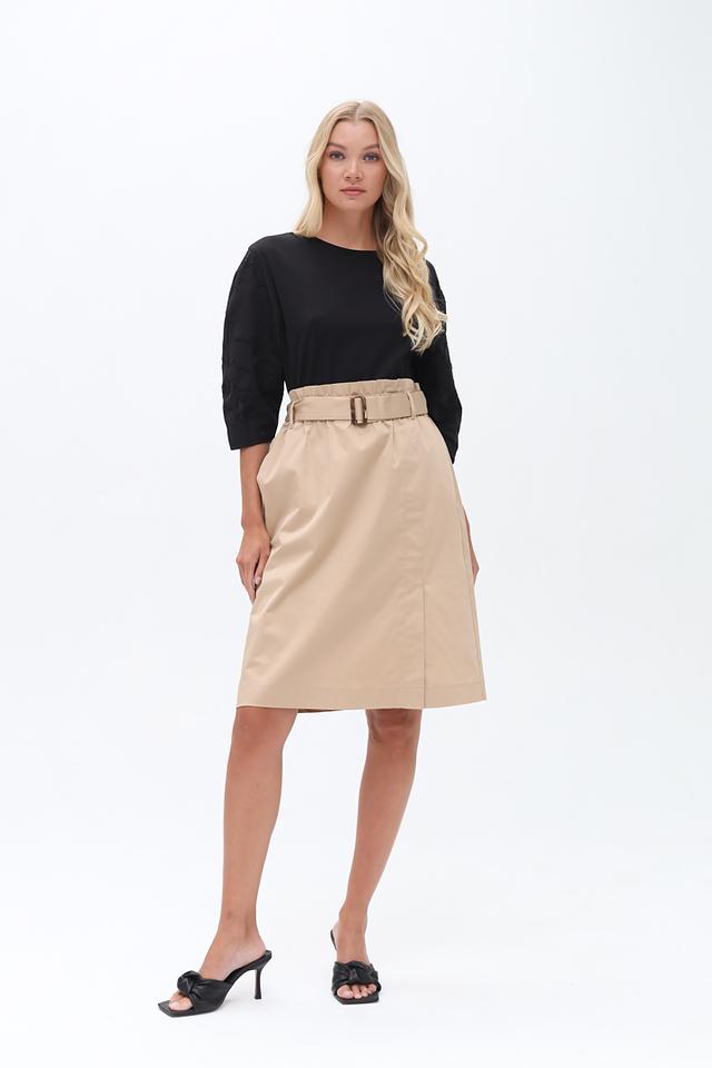 Юбка имеет прямой крой и длину до колена, что делает ее универсальной и подходящей для различных случаев. Эластичный пояс с пряжкой акцентирует талию и придает фигуре более женственный силуэт. Небольшой разрез сзади обеспечивает дополнительный комфорт при ходьбе.