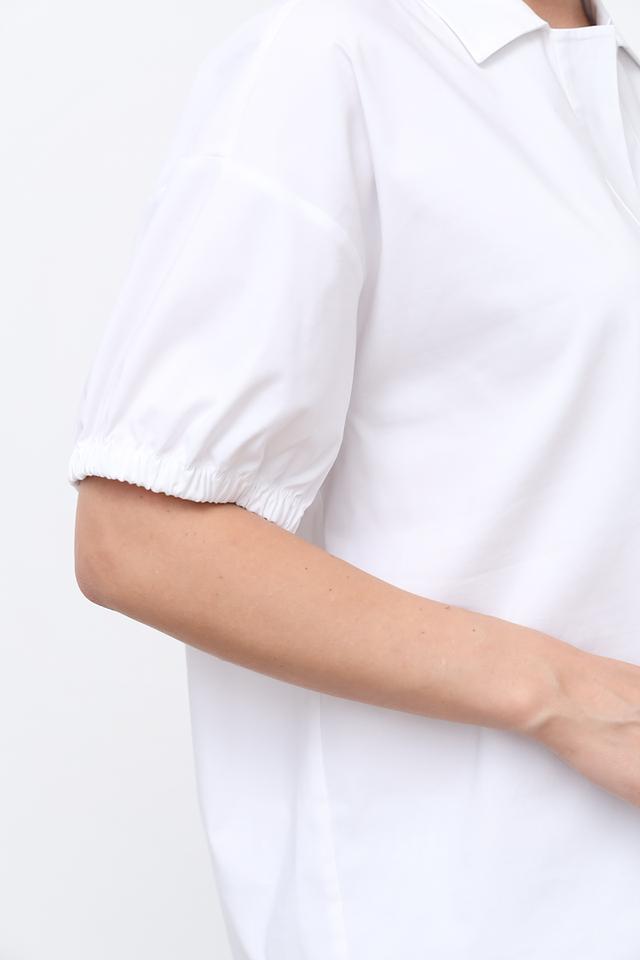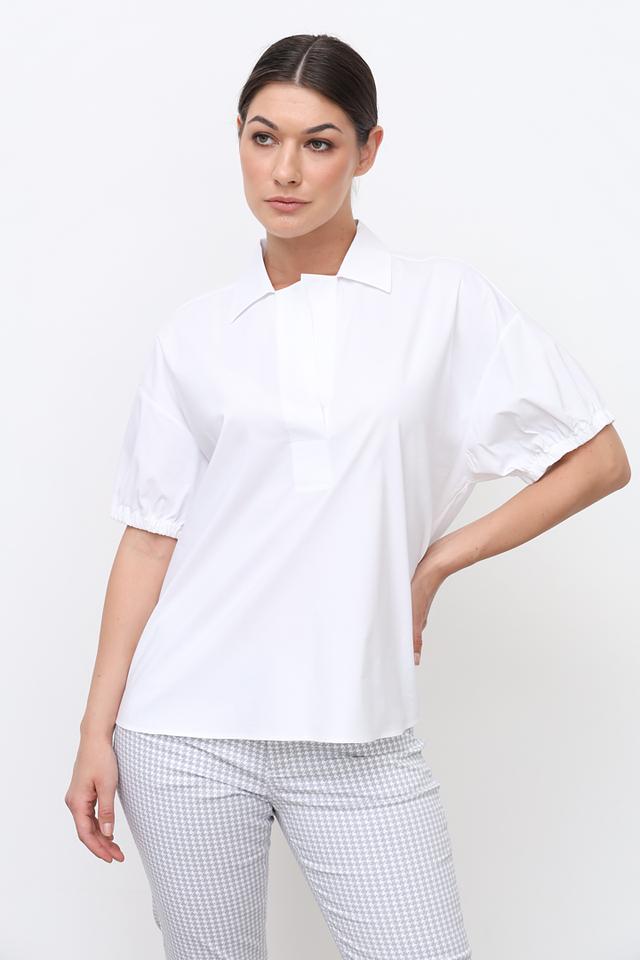Блуза имеет короткие рукава с небольшими сборками по краю, что придает ей лёгкость и воздушность. Воротник-стойка добавляет изысканности и оригинальности. Застёжка выполнена в виде небольшого разреза с пуговицей в верхней части.