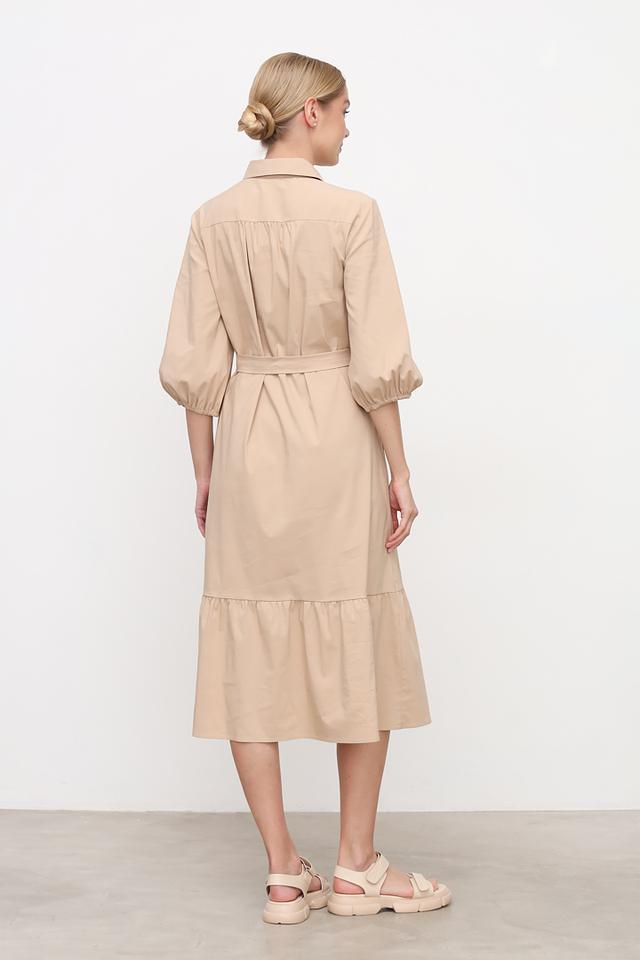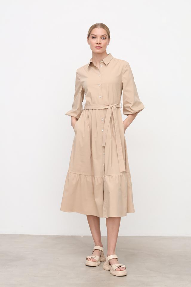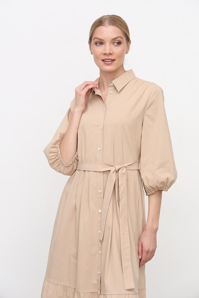 Платье имеет классический рубашечный крой с воротником и застежкой на пуговицы по всей длине. Пояс позволяет подчеркнуть талию и создать более женственный силуэт. Рукава 3/4 с манжетами добавляют образу изысканности.