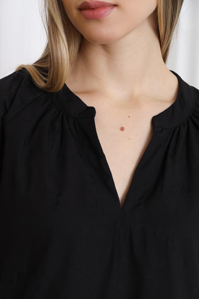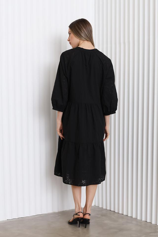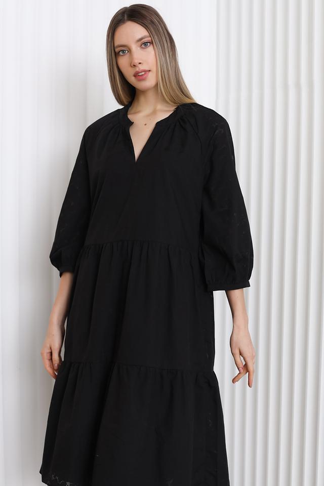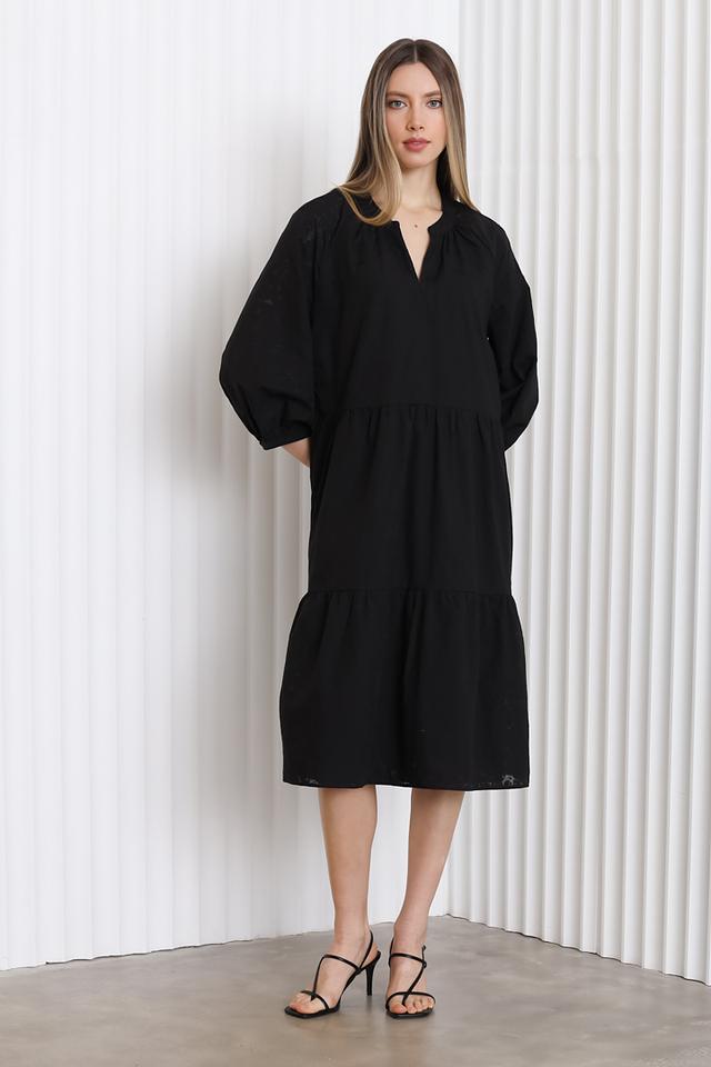 Модель имеет длину миди, что делает её универсальной для различных случаев. Рукава 3/4 и V-образный вырез придают платью женственность и изящество. Свободный крой обеспечивает комфорт при носке.