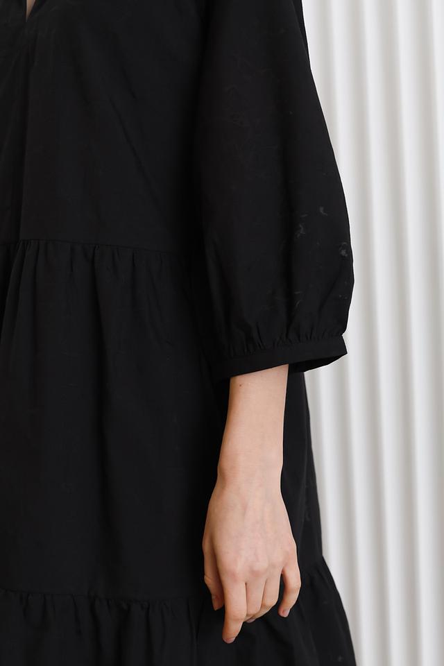 Платье имеет многослойную юбку, которая придает ему объем и легкость. Сборки на груди и рукавах добавляют платью текстуру и интересные детали.