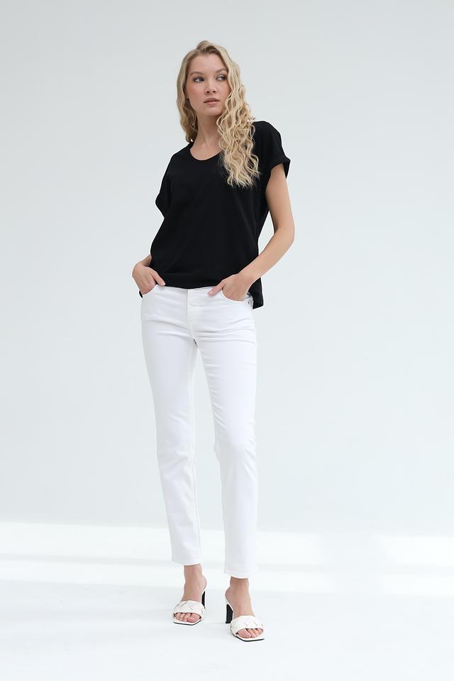 Модель имеет свободный крой, который обеспечивает комфорт и свободу движений. Короткие рукава с аккуратными подворотами добавляют образу лёгкости и непринуждённости.