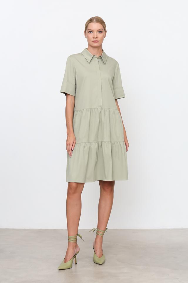 Особенностью этого платья является воротник рубашечного типа и многоярусная юбка, которая придает образу легкость и женственность. Платье застегивается на пуговицы по всей длине.