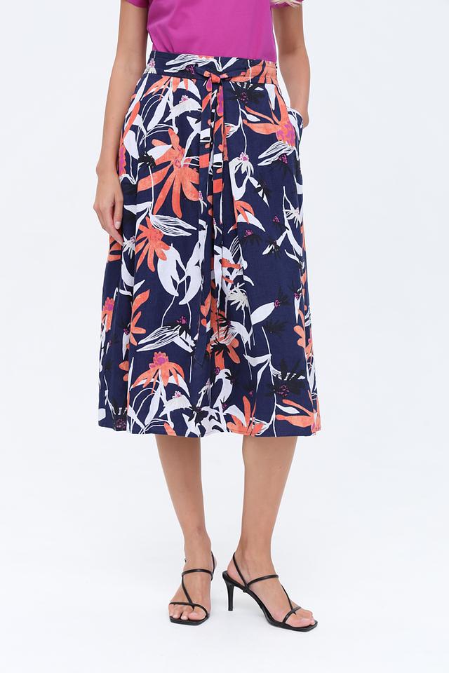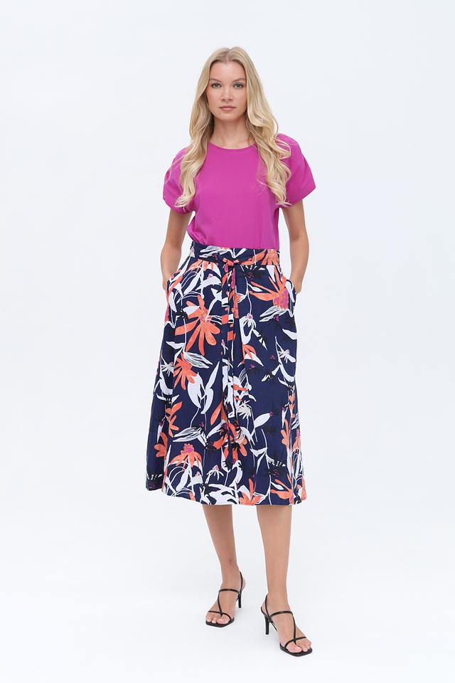Юбка имеет приталенный силуэт и длину миди, подчеркивающую женственность. Яркий цветочный принт на синем фоне делает эту модель особенно привлекательной и запоминающейся. Завязки на талии позволяют регулировать посадку и создавать различные силуэты.
