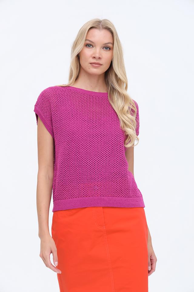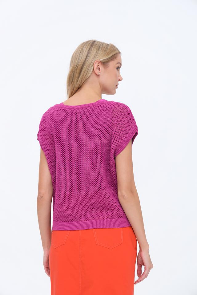 Яркий фуксиевый цвет пуловера добавит образу свежести и женственности. Ажурный трикотаж придает модели легкость и воздушность, делая ее идеальным выбором для теплой погоды.