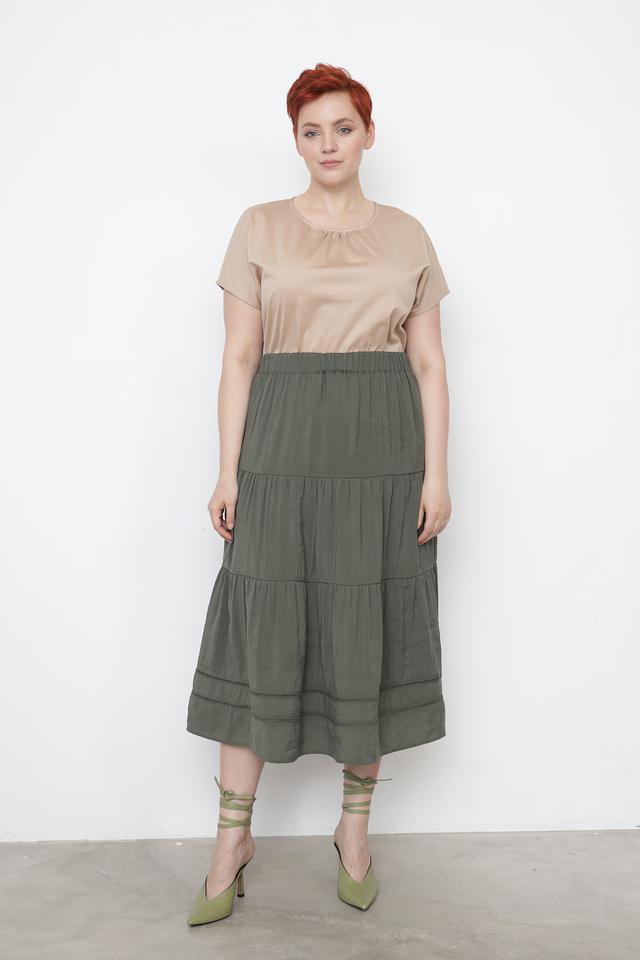 Эластичный пояс обеспечивает удобную посадку по фигуре. Юбка идеально подходит для создания повседневных и элегантных образов. Она хорошо сочетается с различными видами блузок, топов и обуви.