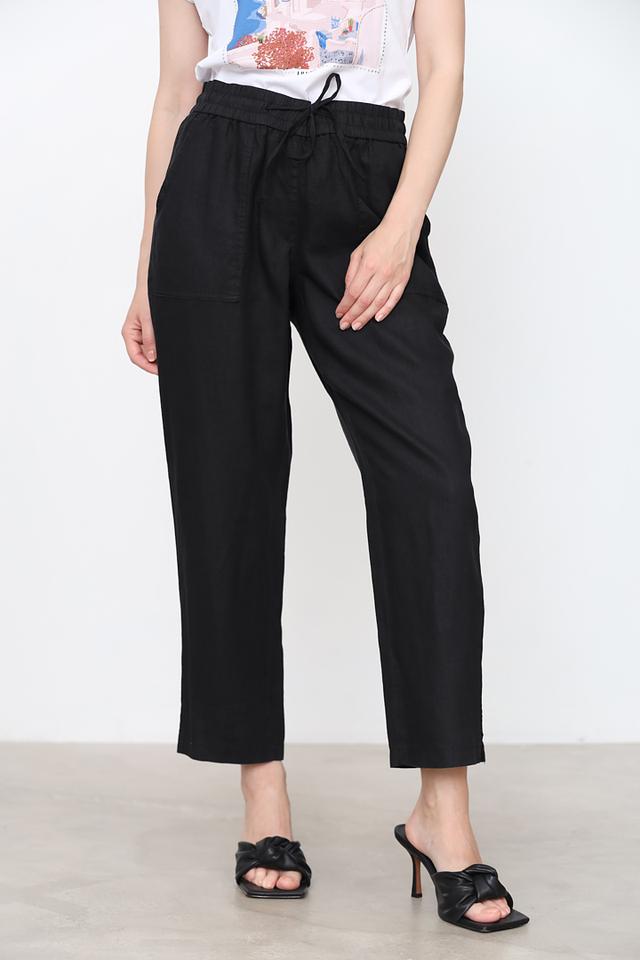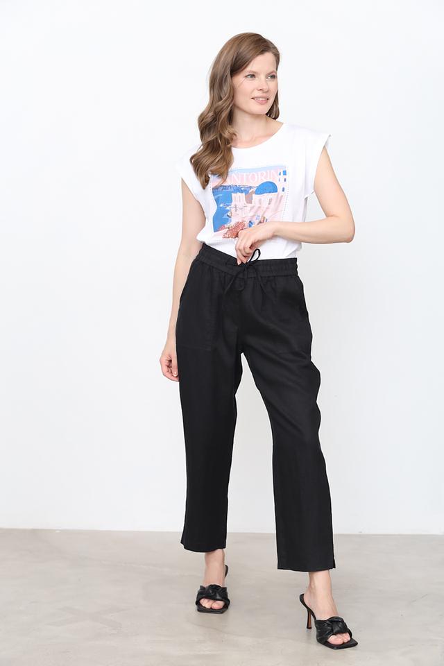 Классический чёрный цвет делает эти капри универсальными и легко сочетаемыми с различными элементами одежды. Прямой крой обеспечивает свободу движений, а эластичный пояс с кулиской позволяет регулировать посадку по фигуре.