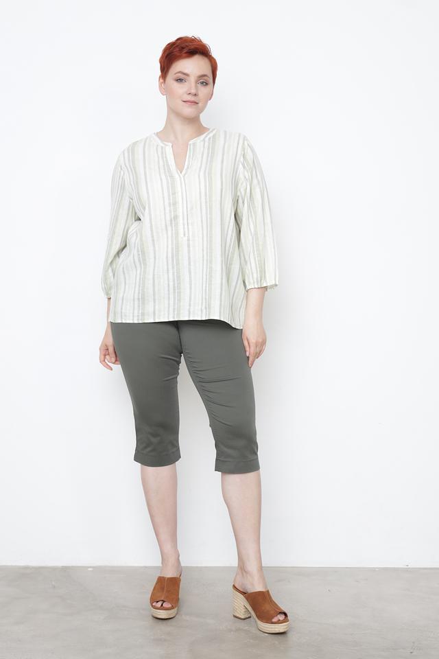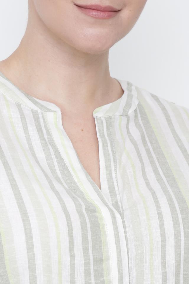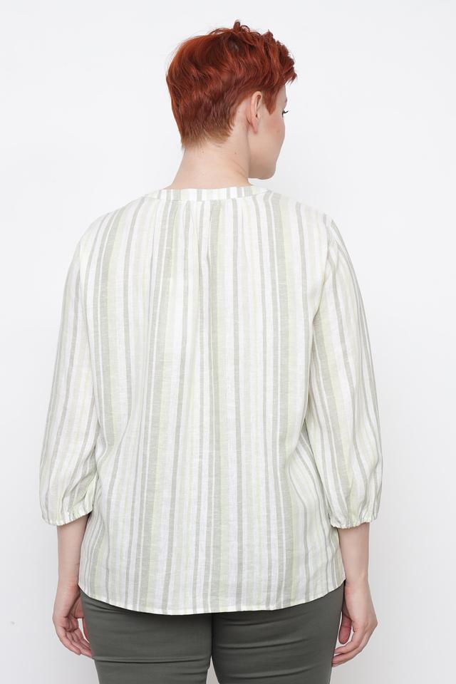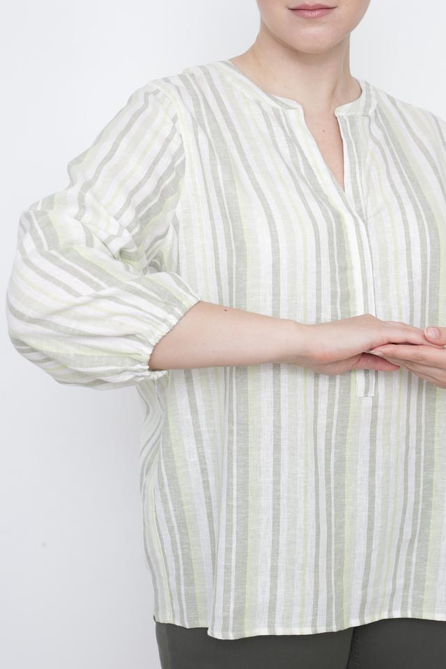 Бежевая блуза Gerry Weber с полосатым принтом и V-образным вырезом. Модель выполнена из лёгкой ткани на основе льна и вискозы, что обеспечивает комфорт в жаркую погоду. Блуза станет отличным дополнением к вашему летнему гардеробу. Состав: лен 55%, вискоза 45%