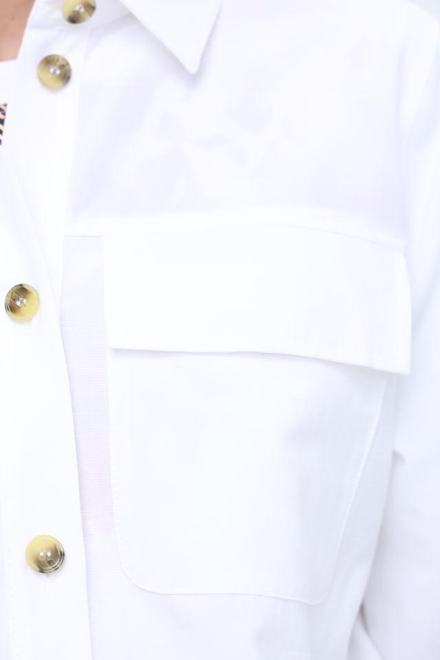 Жакет имеет прямой крой, который обеспечивает комфортную посадку по фигуре. Застёжка на пуговицы позволяет регулировать степень прилегания, а боковые карманы добавляют функциональности. Состав ткани включает вискозу, лён, полиэстер и эластан, что обеспечивает приятные тактильные ощущения и лёгкость в уходе.