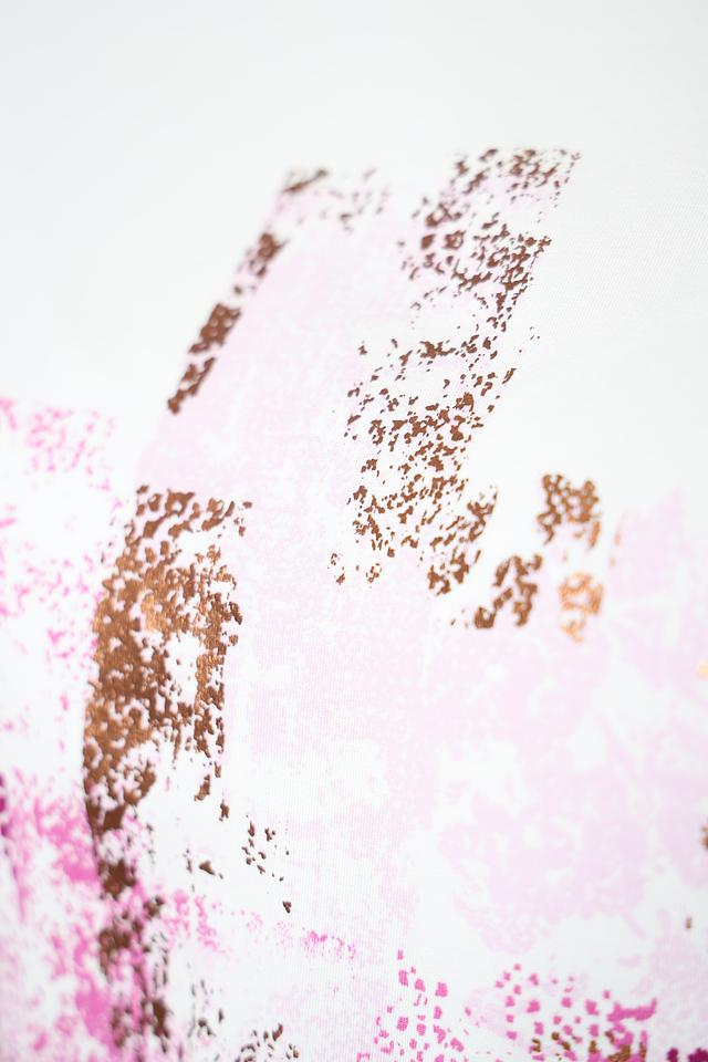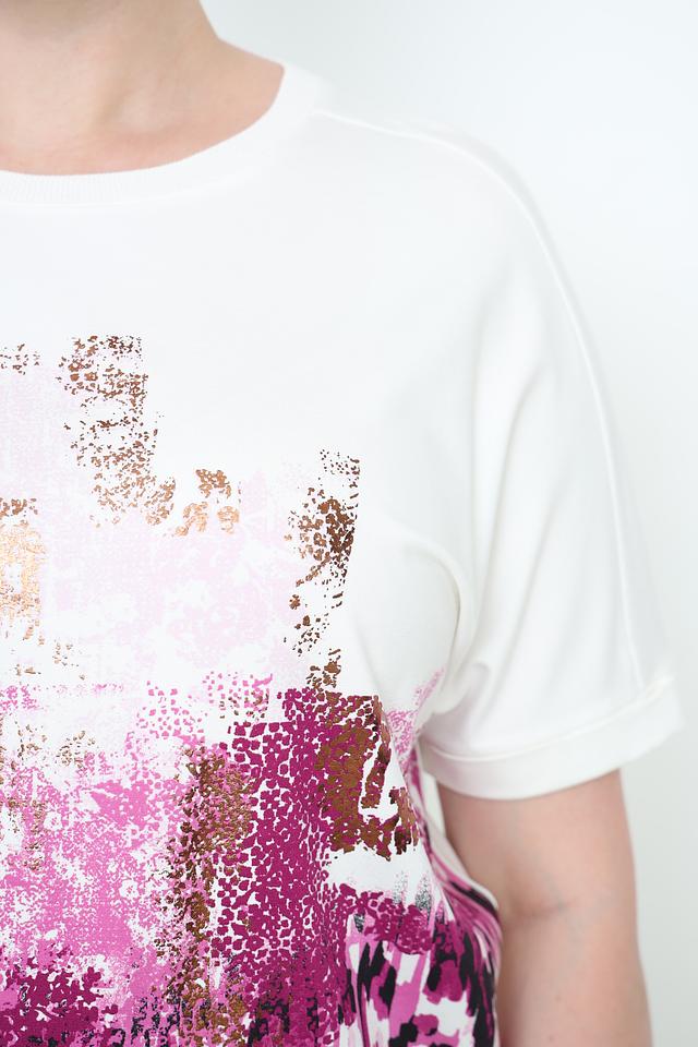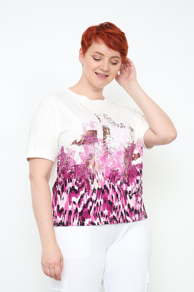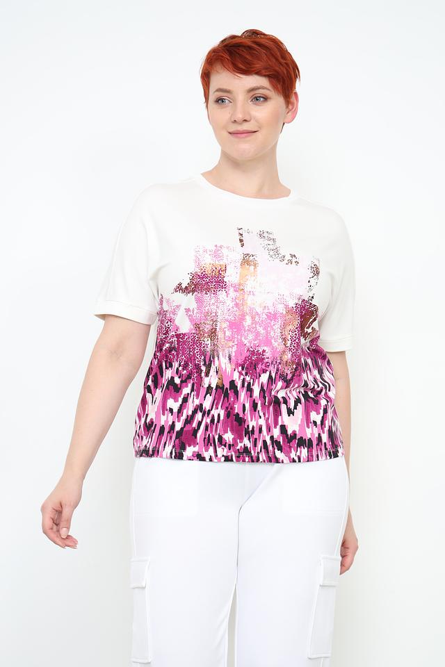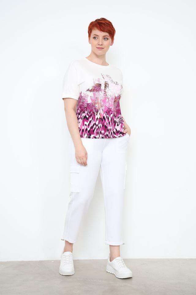 Основной цвет футболки – белый, но её украшает яркий и необычный принт в розово-фиолетовой гамме. Принт выполнен в абстрактном стиле, добавляя образу оригинальности и динамики.