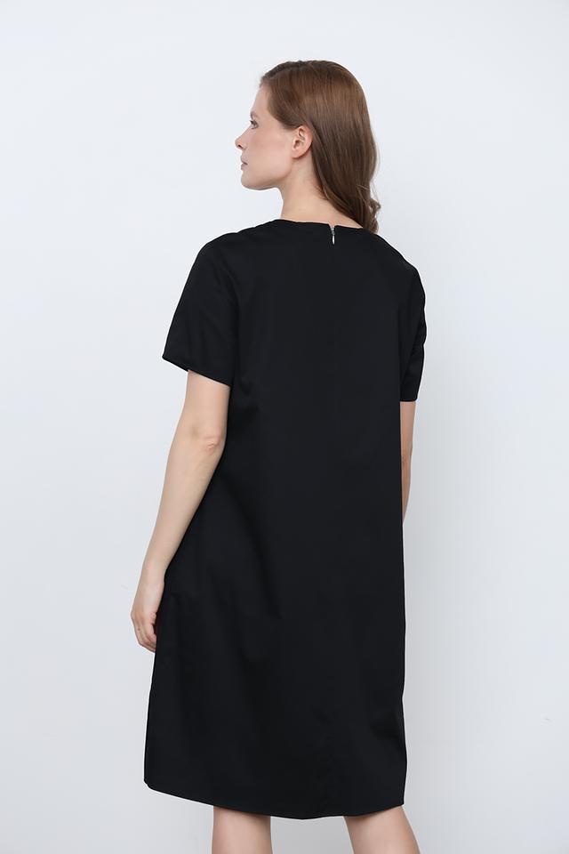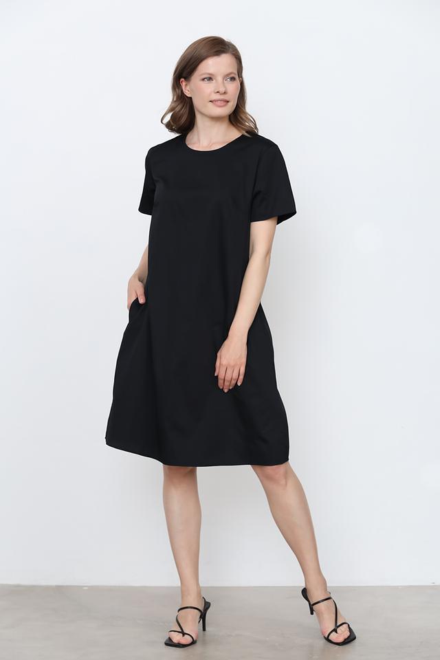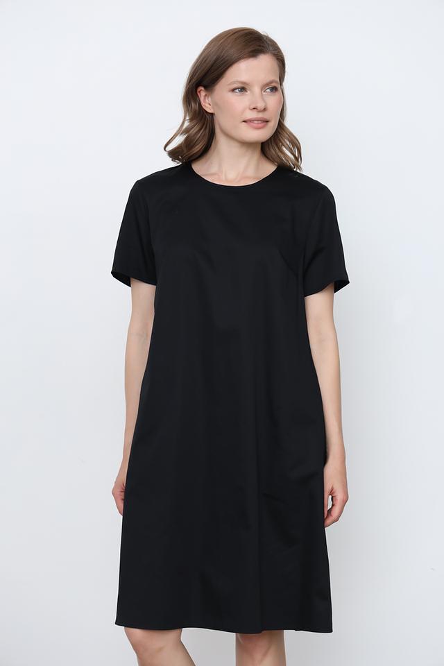Модель отличается короткими рукавами и круглым вырезом горловины. Платье имеет длину до колена, что делает его универсальным вариантом для различных случаев. Наличие боковых карманов добавляет практичности.
