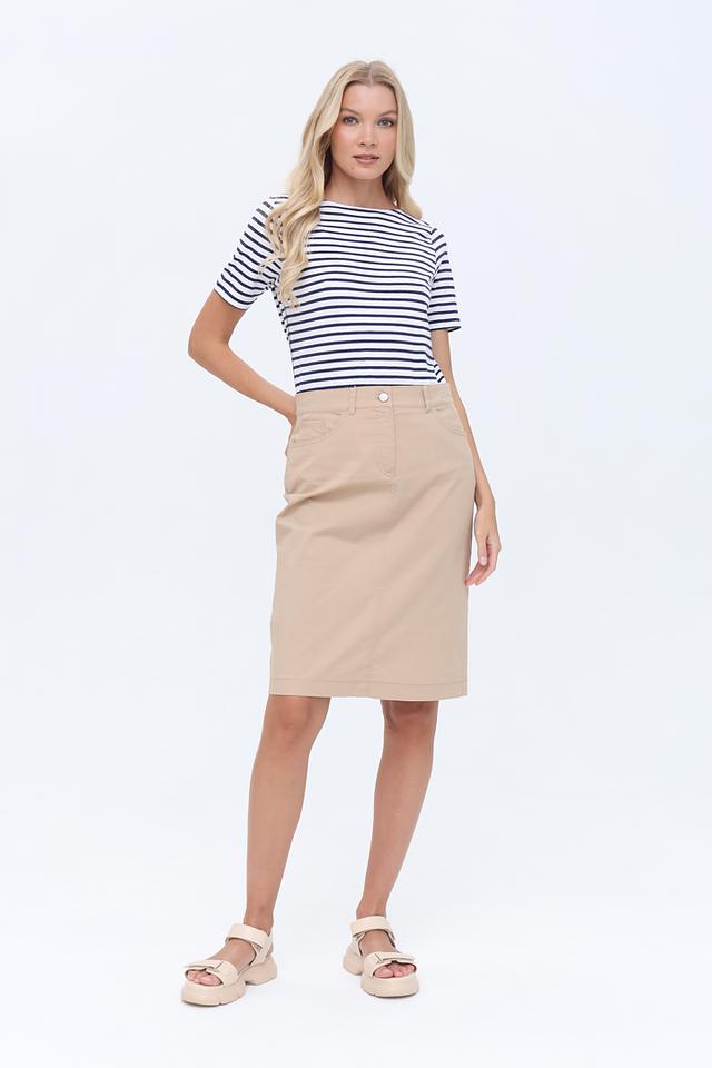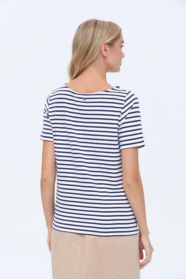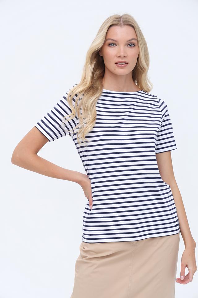 Женская футболка Gerry Weber синего и белого цвета в классическую полоску. Изготовлена из мягкого и приятного к телу модала с добавлением хлопка и эластана, обеспечивающих комфорт и свободу движений. Состав: модал 50%, хлопок 45%, эластан 5%