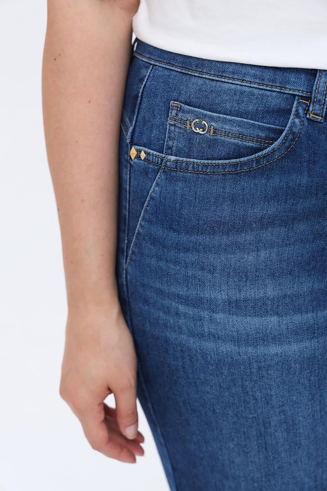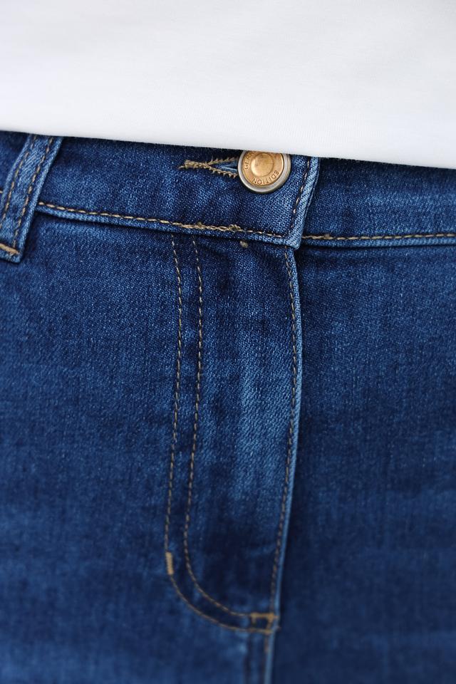 Застежка на молнию и пуговицу, а также пять карманов – два спереди, два сзади и один небольшой карман для мелочи. Декоративная отстрочка на задних карманах добавляет стильный акцент. Высокая посадка обеспечивает дополнительный комфорт и поддержку.