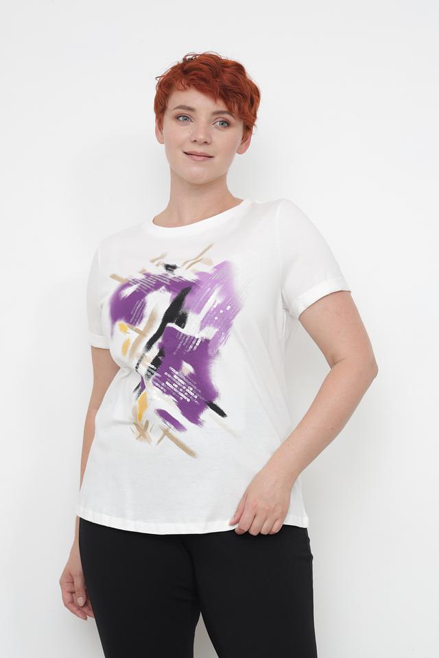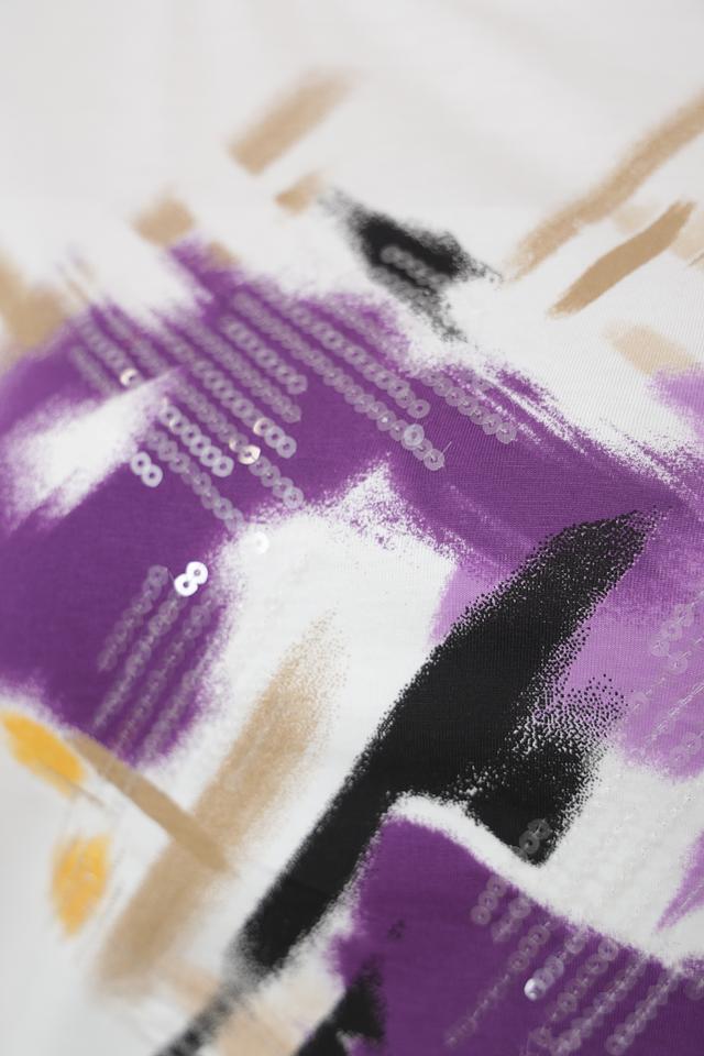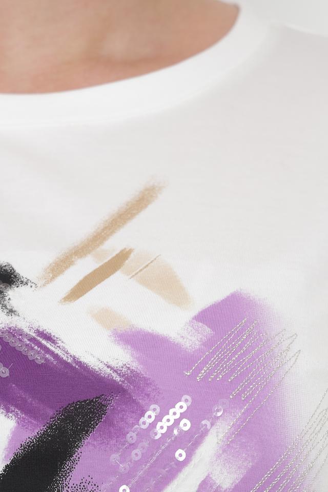 Белая футболка Gerry Weber EDITION с абстрактным принтом в фиолетовых и жёлтых тонах. Изготовлена из органического хлопка, обеспечивающего комфорт и воздухопроницаемость. Стильный и удобный вариант для повседневного образа. Состав: хлопок органич. 100%