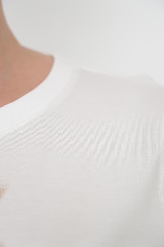 Круглый вырез горловины и короткие рукава обеспечивают комфорт в носке. Свободный крой футболки позволяет ей хорошо сидеть на фигуре, не сковывая движений. Эта модель идеально подходит для создания повседневных образов, которые сочетают в себе стиль и удобство.