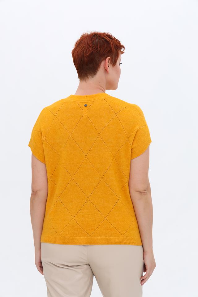 Этот женский пуловер от Gerry Weber выполнен в приятном горчичном цвете и украшен выразительным узором в виде ромбов. Модель имеет V-образный вырез и короткие рукава, что делает ее отличным выбором для теплой погоды или для создания многослойных образов.