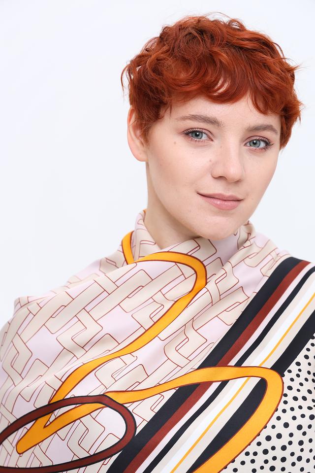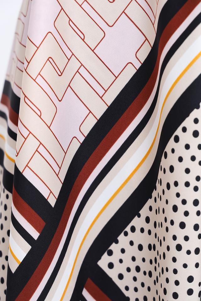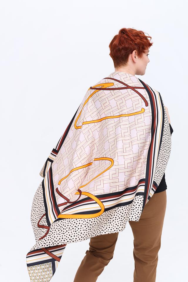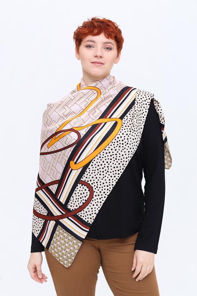 Платок имеет бежевый фон, украшенный ярким и динамичным принтом, сочетающим в себе геометрические фигуры, абстрактные элементы и цветочные мотивы в горчичных, коричневых и чёрных тонах.