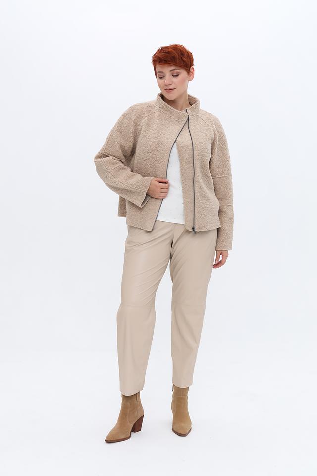 Куртка застегивается на молнию, которая проходит по всей длине изделия. Воротник-стойка добавляет куртке аккуратный вид. Текстура ткани напоминает мягкий плюш или овечью шерсть, что придает куртке особый шарм и тепло.