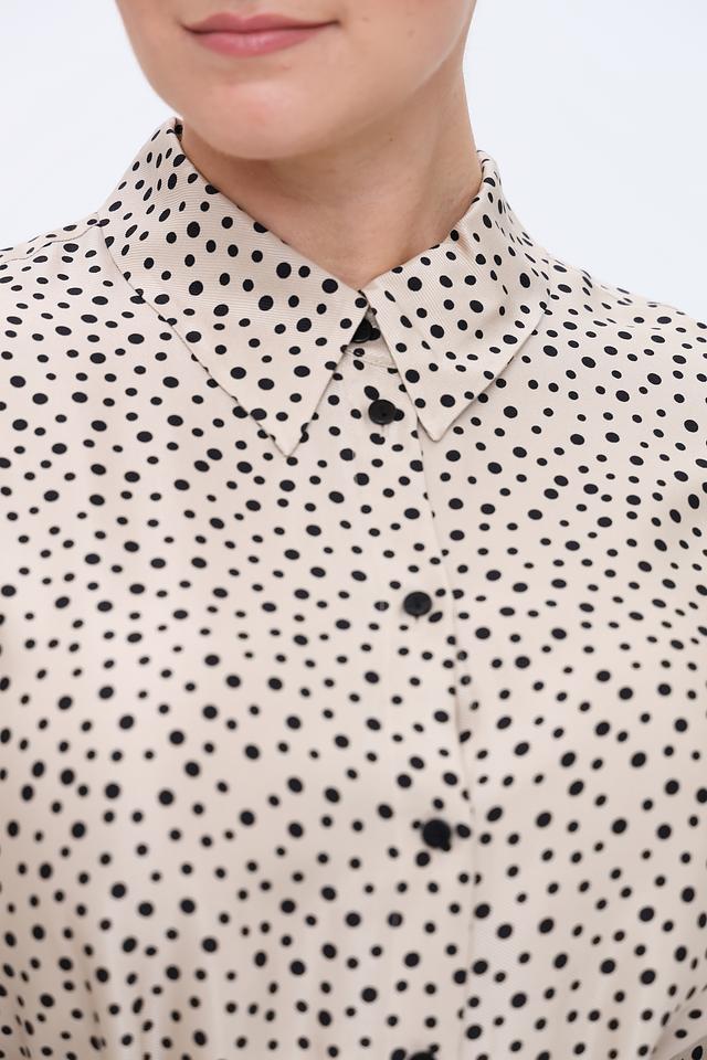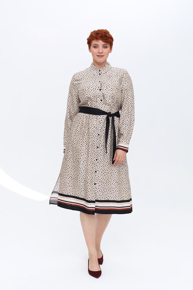 Особенностью этого платья является оригинальный принт в горошек бежевого и черного цветов, а также контрастная полоска в нижней части изделия. Состав ткани обеспечивает легкость и воздухопроницаемость. Это платье станет отличным выбором для создания стильного и женственного образа.