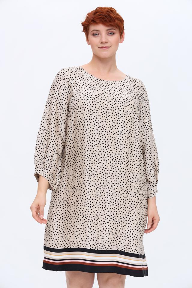 Платье Gerry Weber бежевого цвета с принтом в горошек и полосатой отделкой низа. Модель выполнена из мягкой вискозы, обеспечивающей комфорт в носке. Идеальный выбор для создания повседневного образа. Состав: вискоза 100%