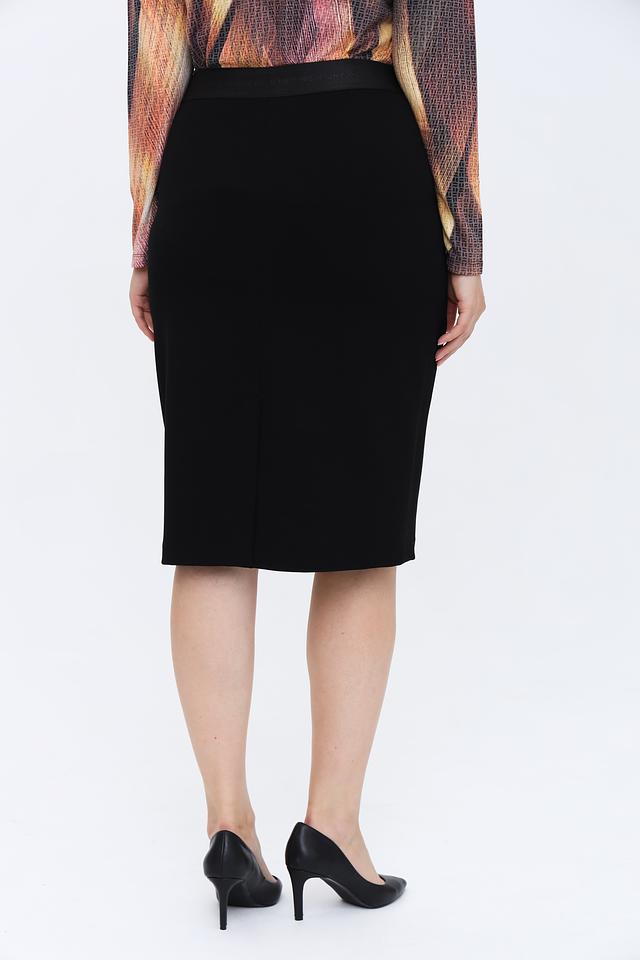 Чёрный цвет юбки позволяет легко сочетать её с различными элементами одежды и аксессуарами. Прямой силуэт и длина до колена подчеркивают достоинства фигуры и создают элегантный образ. Эластичный пояс обеспечивает удобную посадку и не сковывает движений.