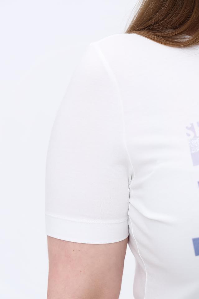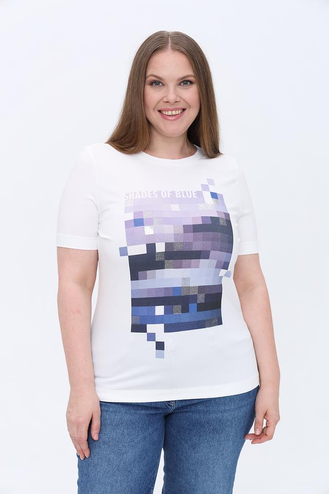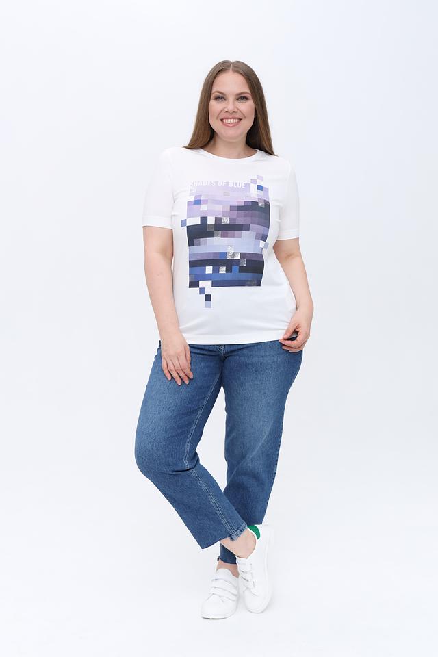 Белая футболка Gerry Weber с оригинальным принтом в оттенках синего и фиолетового. Изготовлена из мягкого и приятного к телу сочетания хлопка и модала, обеспечивающего комфорт в носке. Состав: хлопок 47%, модал 47%, эластан 6%