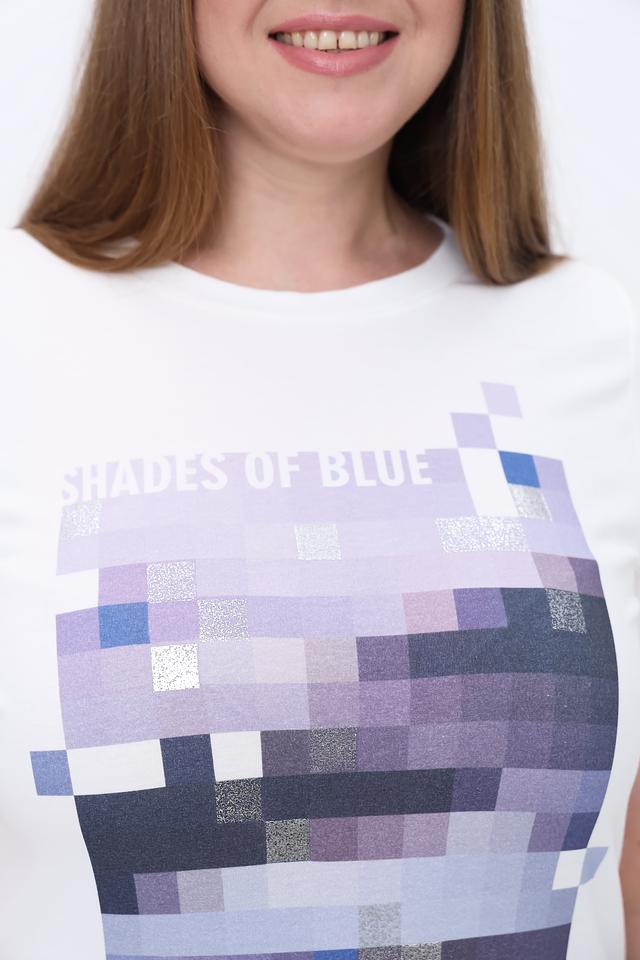 Эта стильная футболка от Gerry Weber станет отличным дополнением к вашему гардеробу. Футболка выполнена в белом цвете и украшена ярким принтом, изображающим абстрактные фигуры в различных оттенках синего и фиолетового. Принт выполнен в технике пиксельной графики и имеет надпись "SHADES OF BLUE".