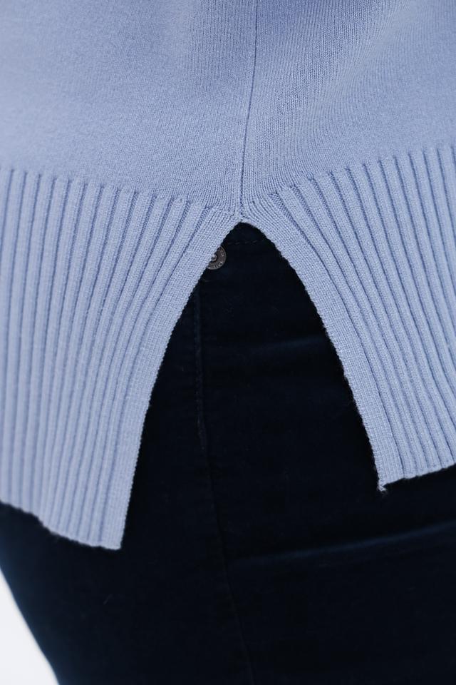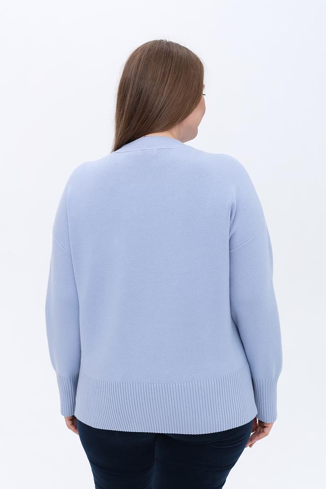 Пуловер имеет прямой крой, круглый вырез горловины и длинные рукава с вязаными манжетами. Низ изделия также оформлен вязаной резинкой. Текстура вязки придает изделию аккуратный и стильный вид.