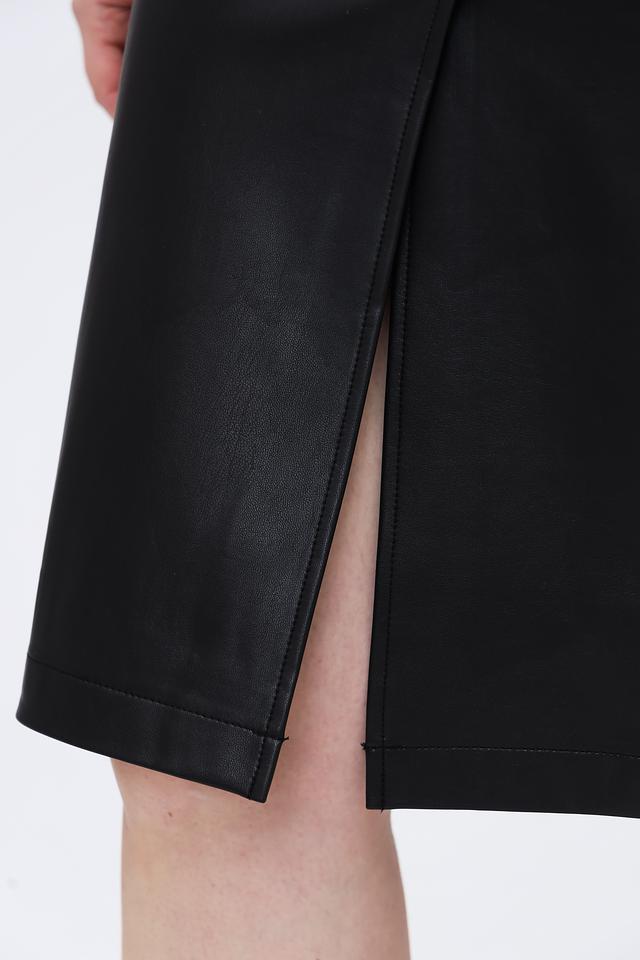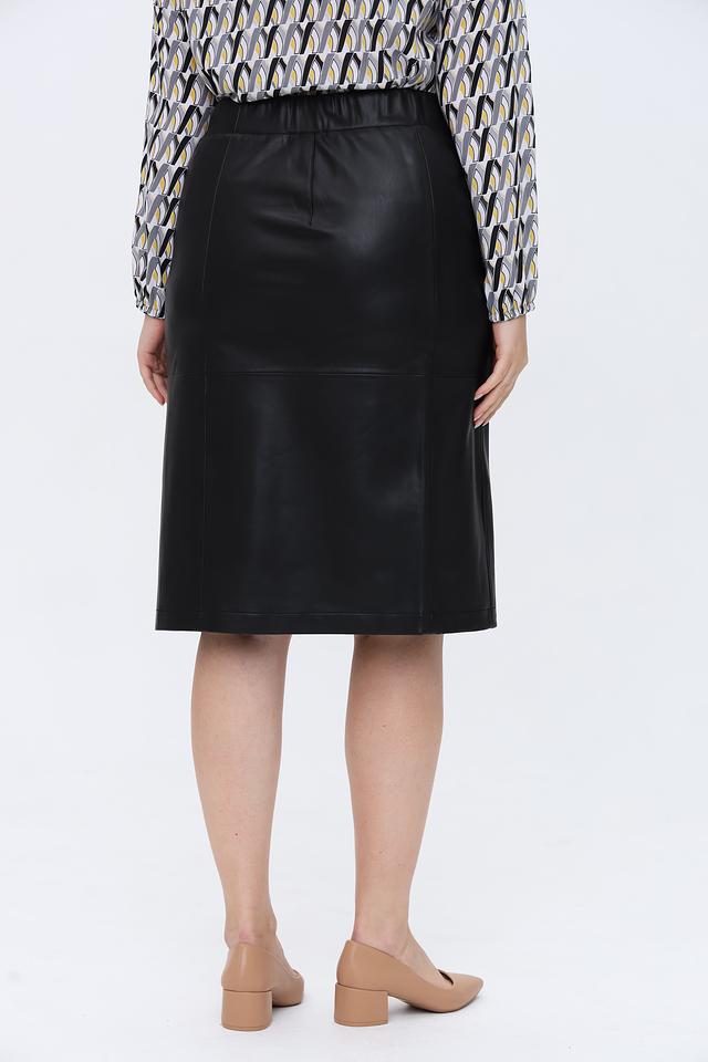 Юбка имеет прямой крой и длину до колена, что делает её универсальной для различных случаев. Эластичный пояс обеспечивает комфортную посадку и подчеркивает талию. Чёрный цвет юбки легко сочетается с различными элементами одежды, позволяя создавать разнообразные образы.