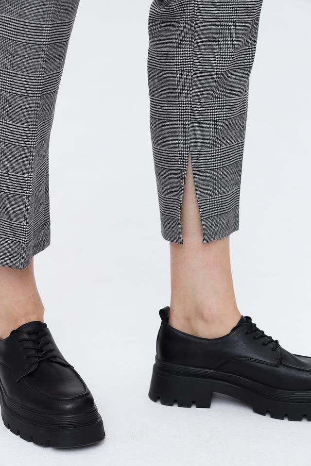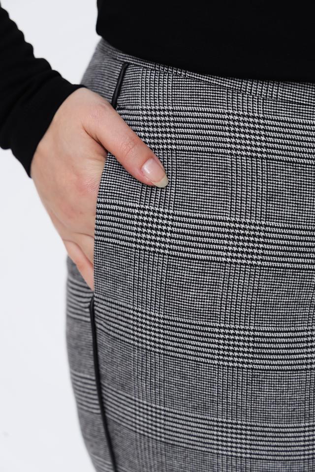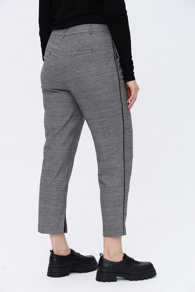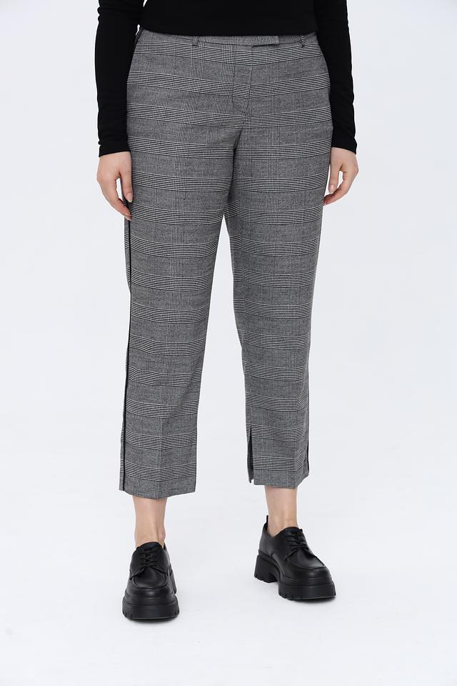 Особенностью модели является клетчатый принт в серых тонах, который легко сочетается с различными элементами одежды. По боковым швам брюк проходит декоративная вставка, добавляющая образу оригинальности. Застежка на молнию и пуговицу, предусмотрены боковые карманы.