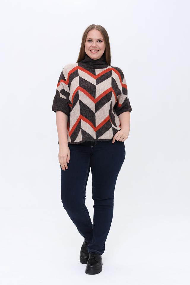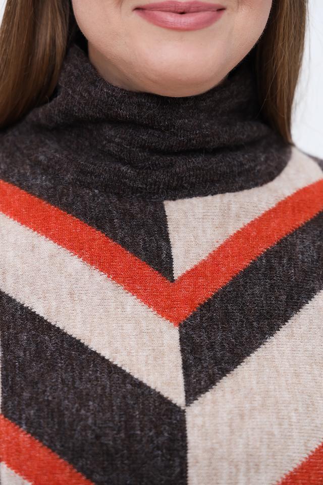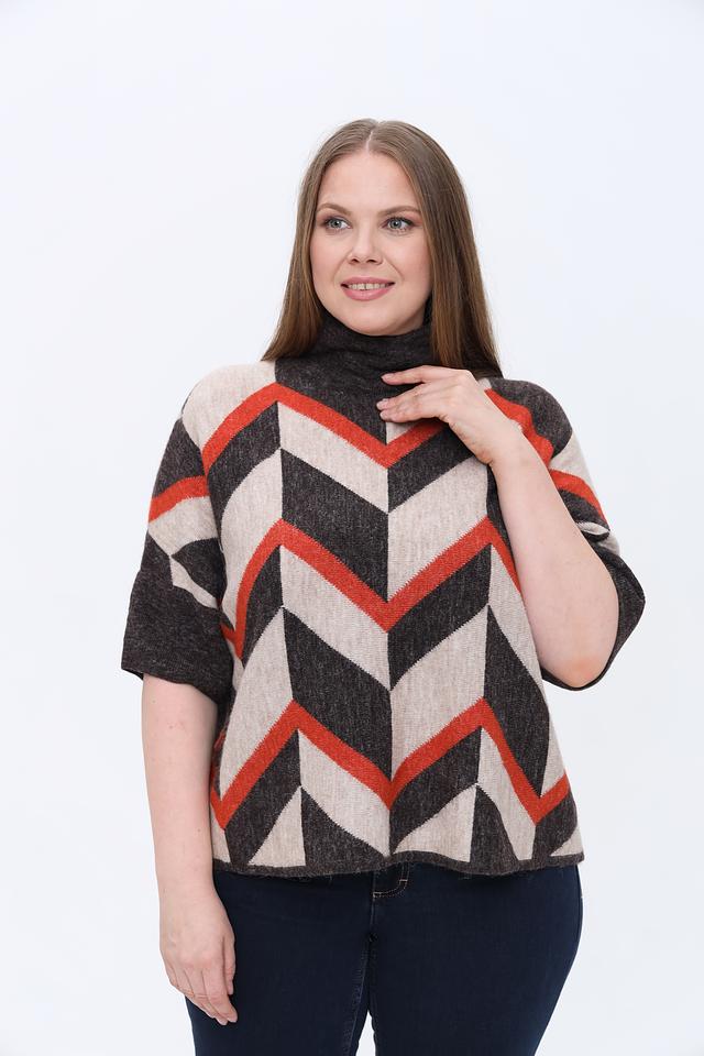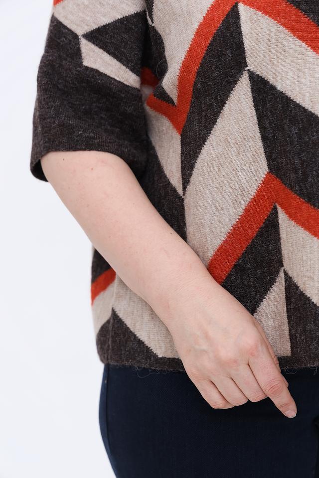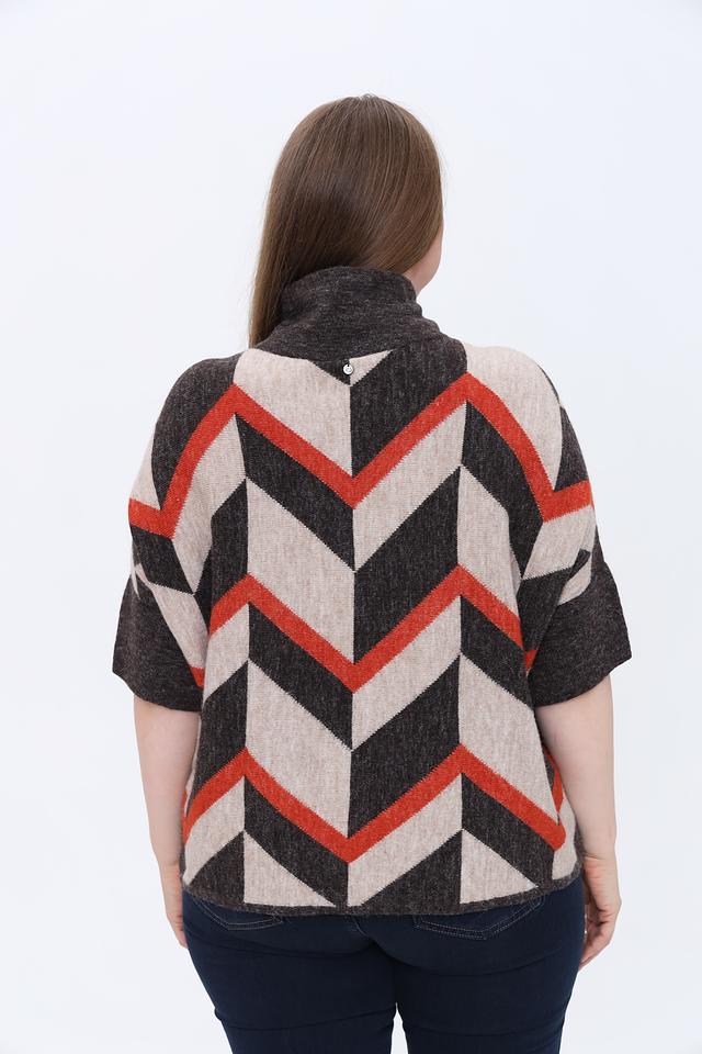 Пуловер имеет оригинальный геометрический узор в коричневой, бежевой и оранжевой гамме, который придает ему особый шарм. Высокий воротник добавляет элегантности, а короткие рукава делают его идеальным для создания многослойных образов.