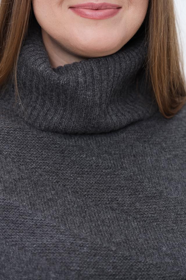 Пуловер имеет свободный, слегка заниженный силуэт, который обеспечивает комфорт в носке и позволяет создавать расслабленные образы. Высокий воротник-стойка добавляет элегантности и защищает от холода. Вязаная текстура придает изделию объем и фактурность.