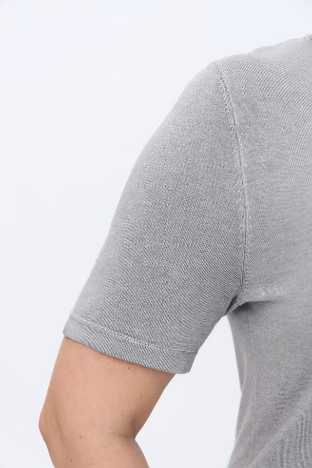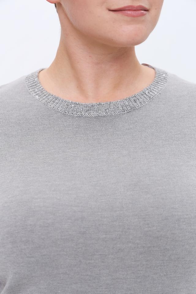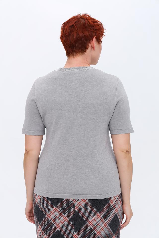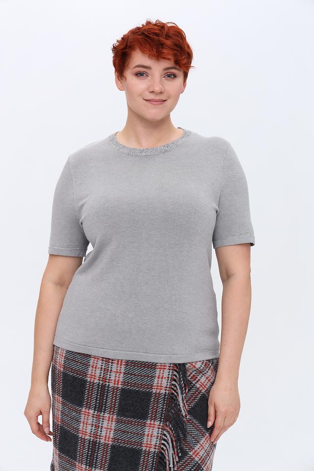 Серый пуловер Gerry Weber с короткми рукавами и декоративной отделкой горловины. Изготовлен из мягкой вискозы с добавлением полиамида для сохранения формы. Идеальный выбор для создания комфортного и стильного образа. Состав: вискоза 80%, полиамид 19%, метализ.полиэстер 1%